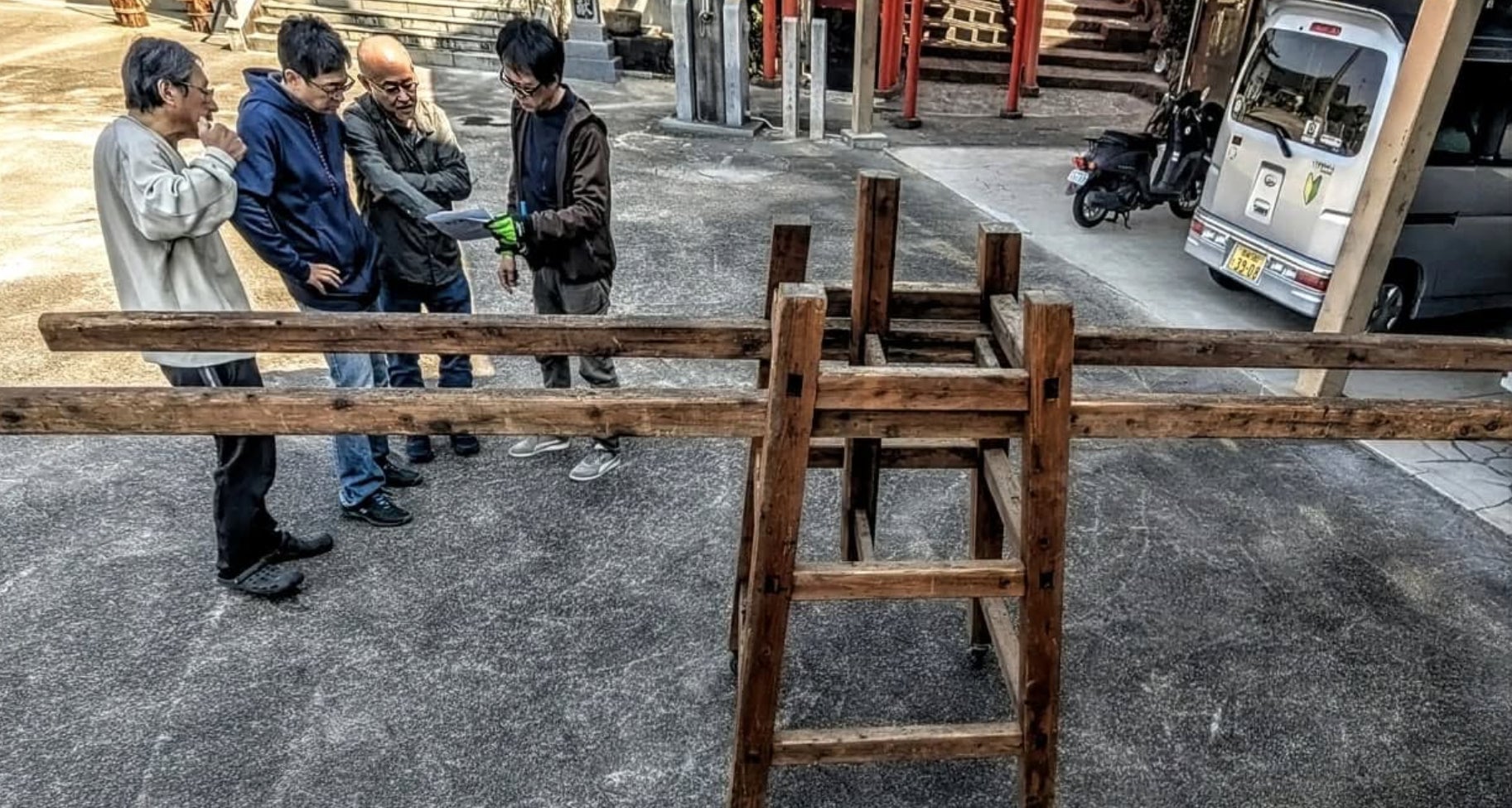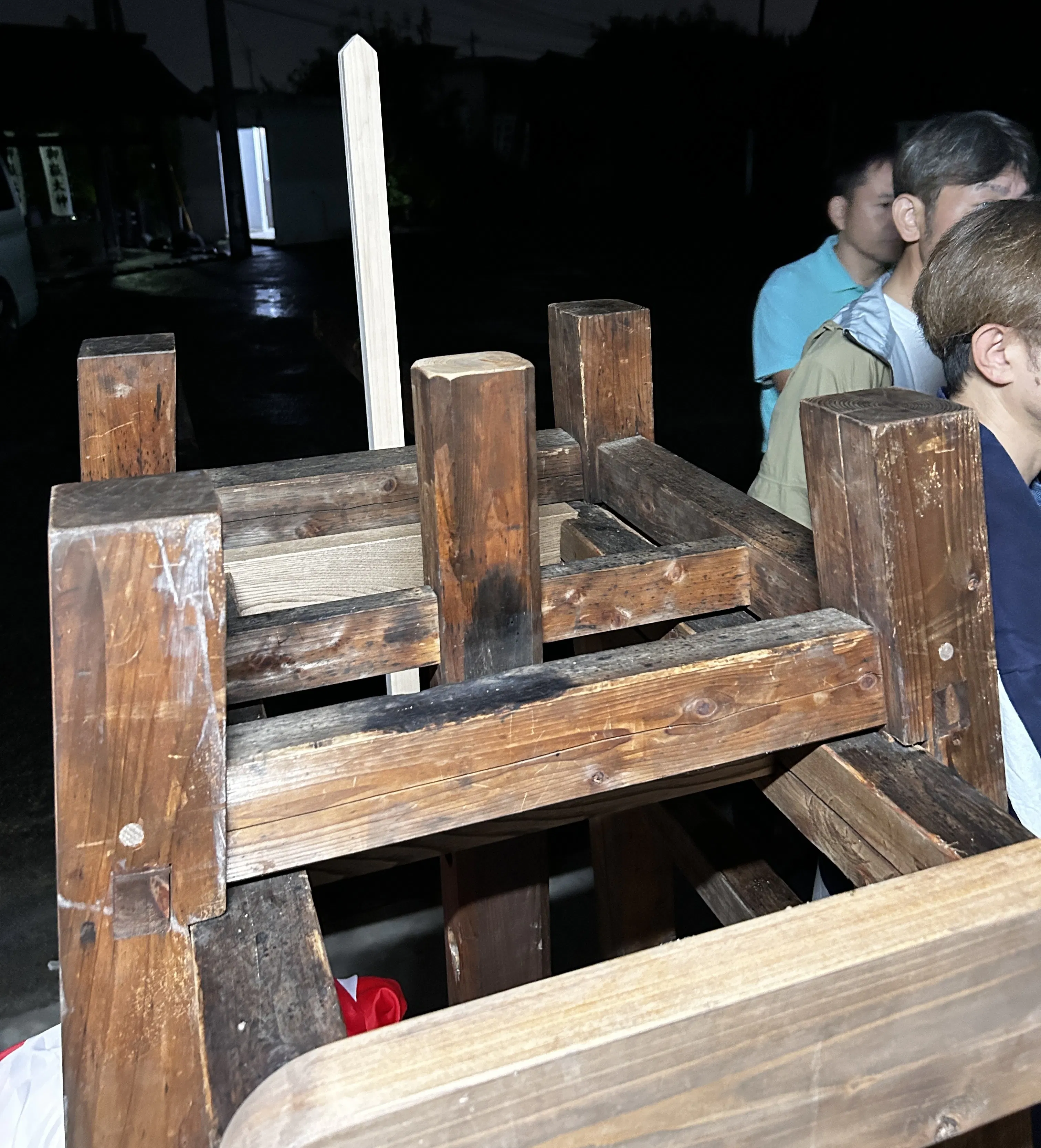 2025/10/11 20:25このプロジェクトをご覧いただいた皆様、実際にご支援いただいた皆様、本当にありがとうございました。皆様のお陰で、無事に櫓の修繕が完了しました。長らく使わずに保管されていた「振込み櫓」はホゾが緩み、人が乗って神事をやり仰ることはもちろん、当屋から神社へ担いで行く道のりでバラバラになりそうな程に傷んでいました。しかし、地元の宮大工さんの手によって、八華連50周年という記念の神事のスタートを安心して任せられる頑強さを取り戻しました。この後も、例大祭に向けた準備をしっかり進めてまいります! もっと見る