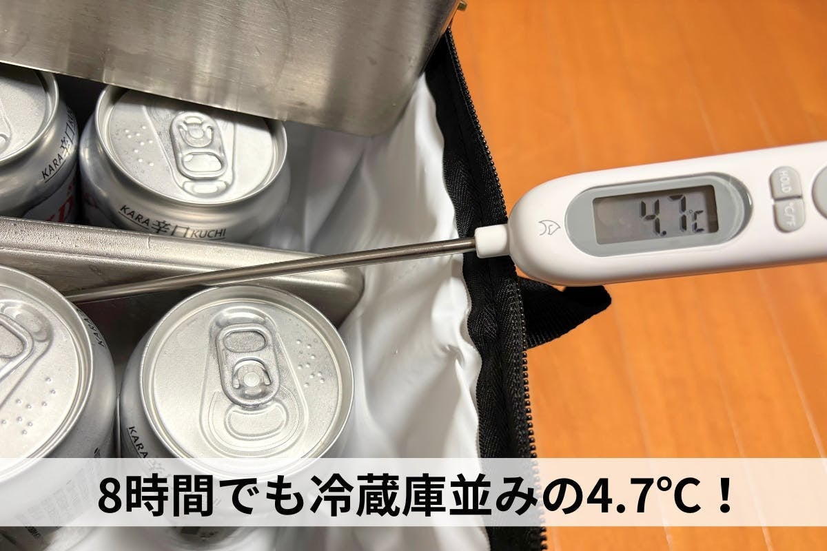 8時間保冷バッグで保冷したビールを実際に飲んでみると、冷蔵庫から出したばかりの温度感と遜色ありませんでした!