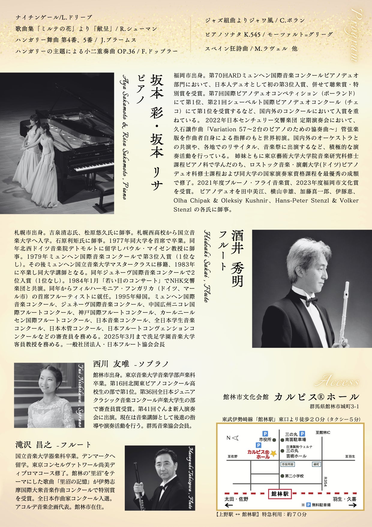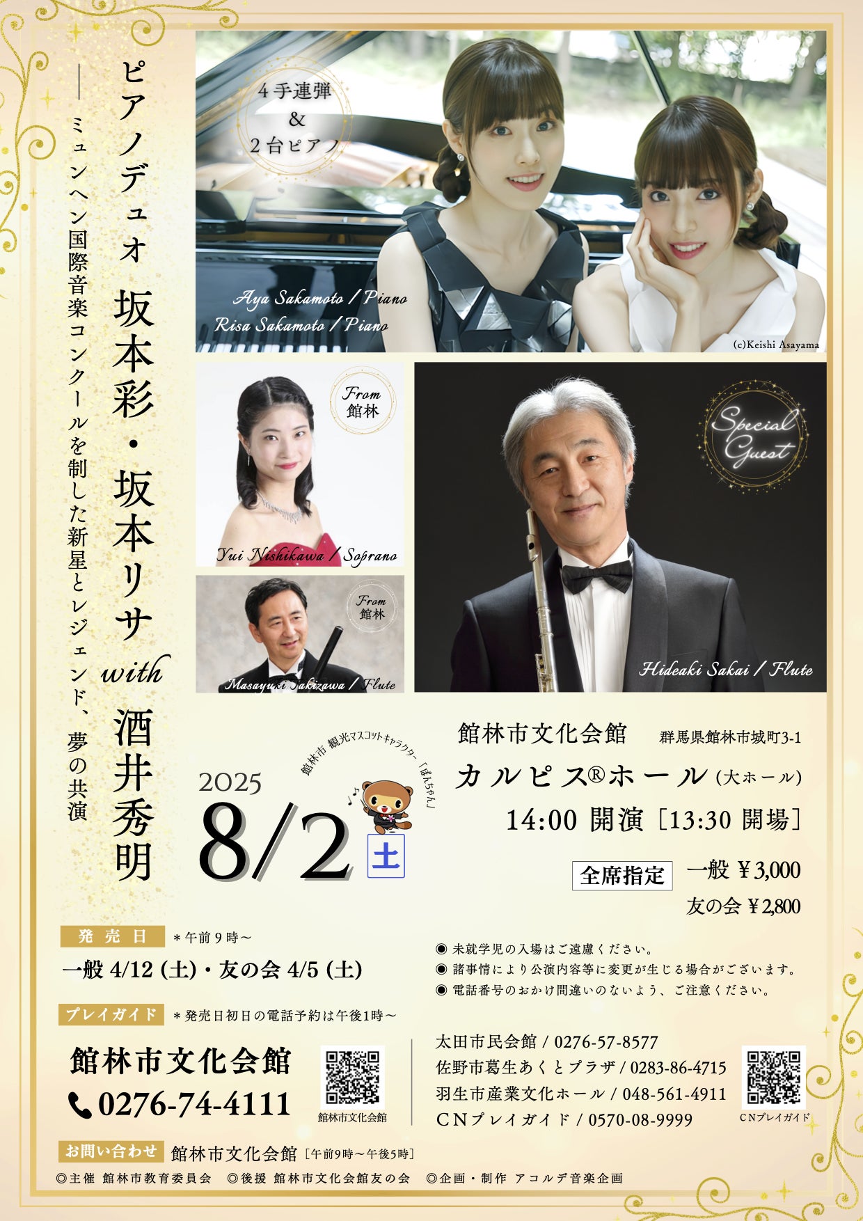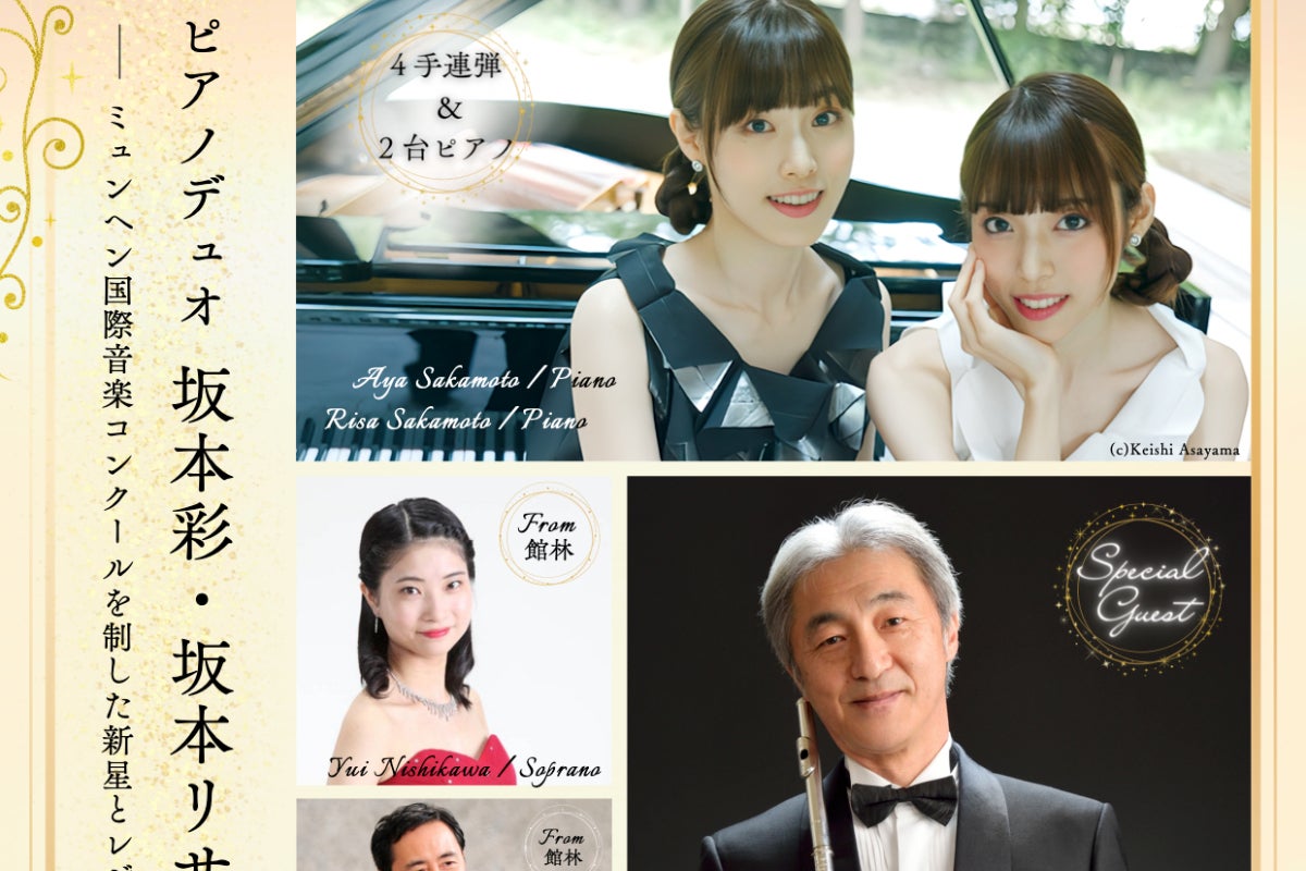 【ピアノデュオ坂本彩・坂本リサ&フルート奏者 酒井秀明 公演】が開催されます。