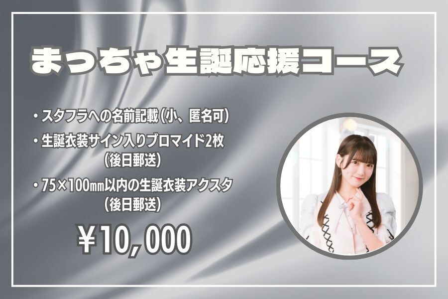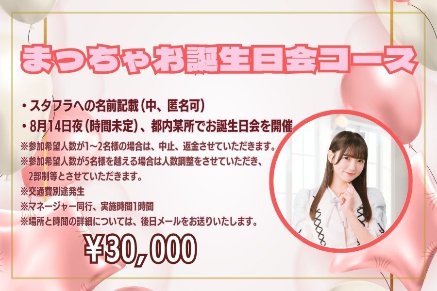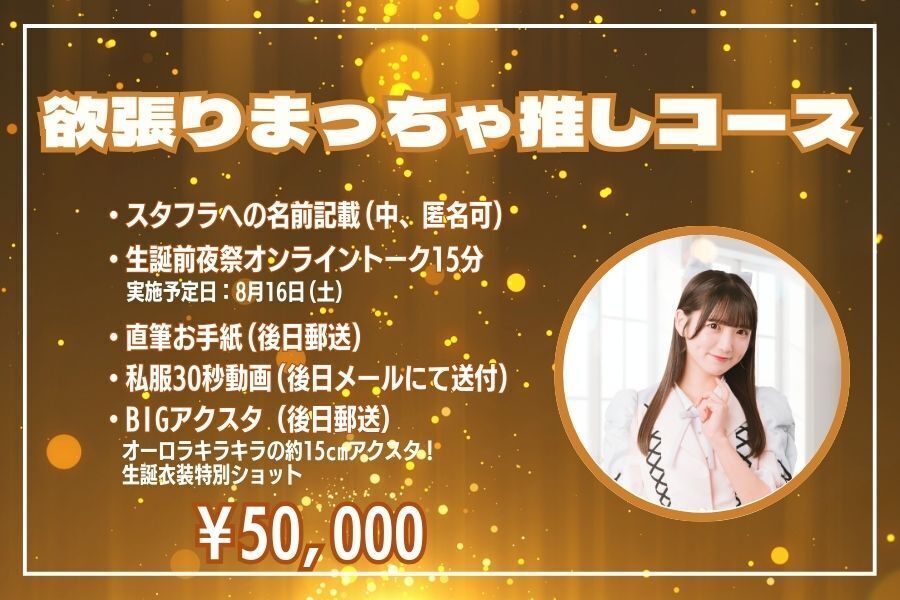 ご支援いただいた金額に応じてリターン品に加え、より豪華な生誕祭を開催できるよう内容を調整させていただきますので、ご理解頂けますと幸いです。