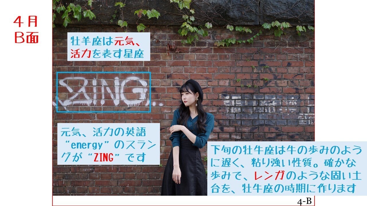 4月のB面にはZINGの文字(“energy”のスラング)