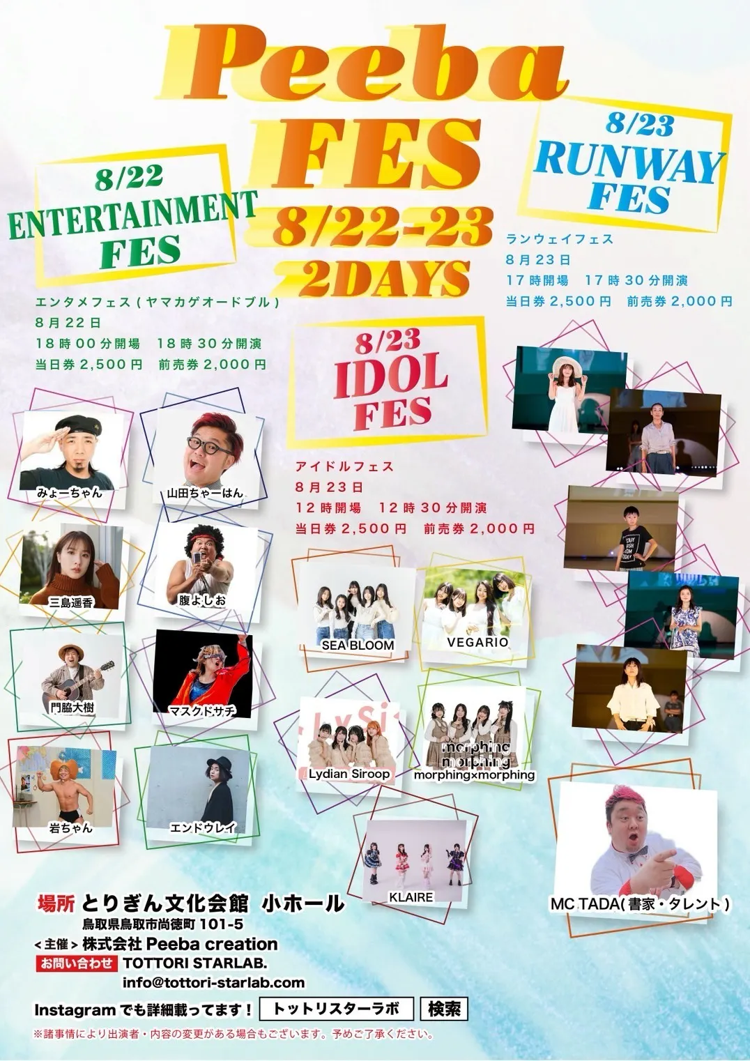 20周年記念イベント『Peeba FES(ピーバフェス)』は、とりぎん文化会館 小ホール を会場に、2025年8月22日(金) と 2025年8月23日(土) の2Daysで実施するイベントです。