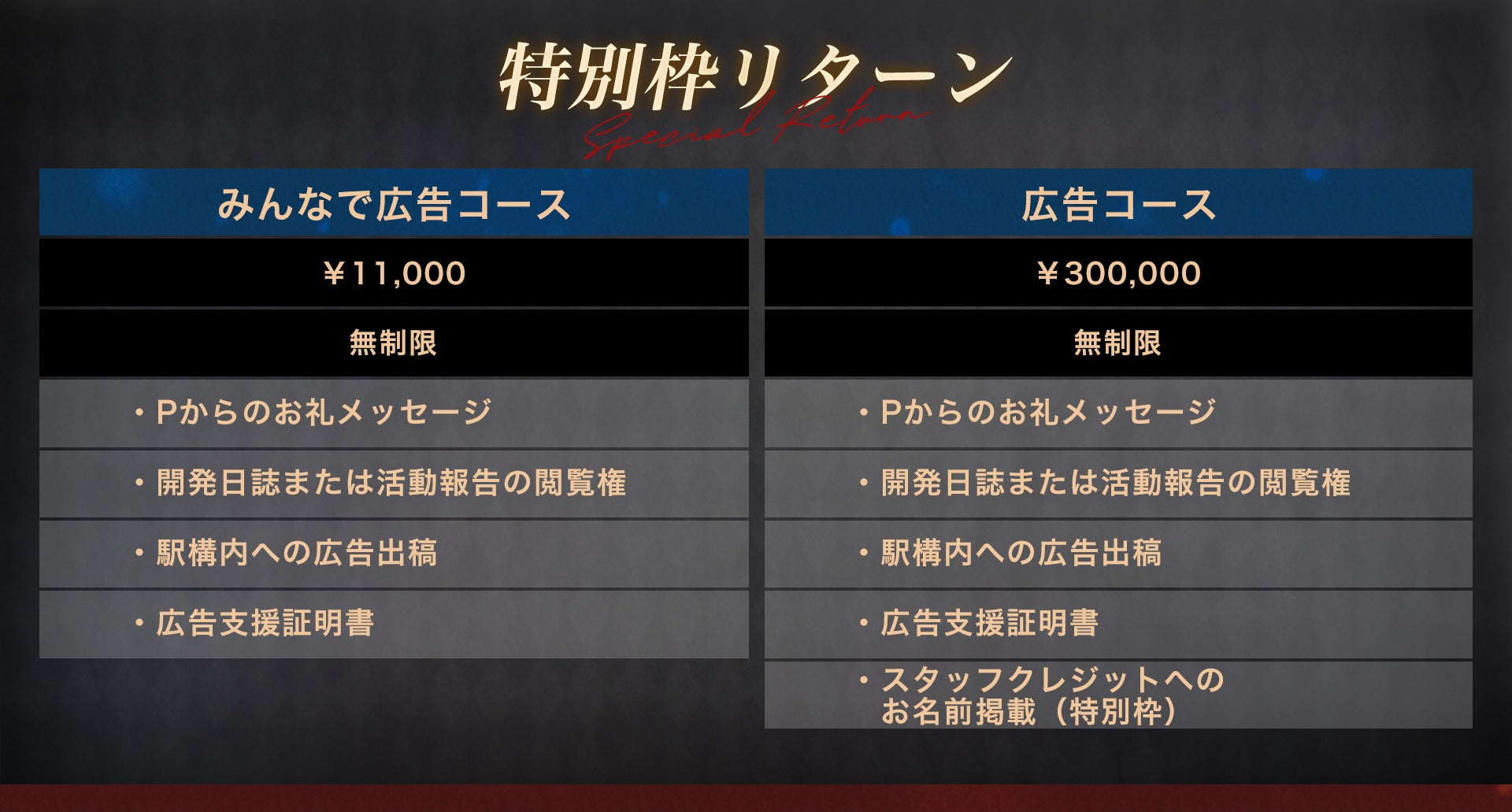 また、高額の支援者様には、エンドクレジットへのお名前掲載や、おまけシナリオに登場するキャラクターの決定権など、本作の一部となっていただけるリターンもご用意しています。