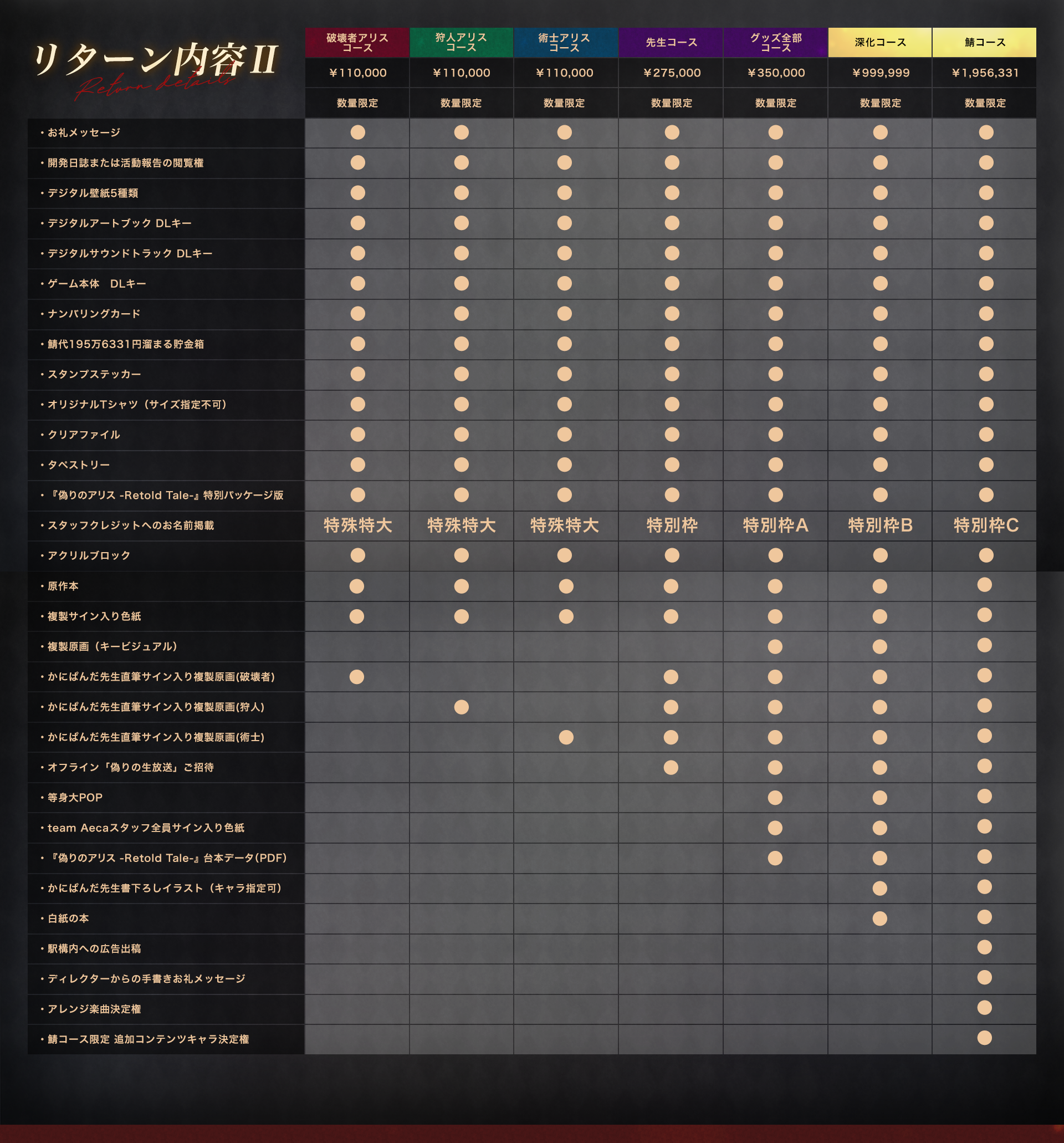 最後に、ここまで愛していただいた『偽りのアリス』というIPを、このプロジェクトを通じてより大きく成長させ、いつの日か 新たな『偽りのアリス』を制作する事を目標としたいと考えています。