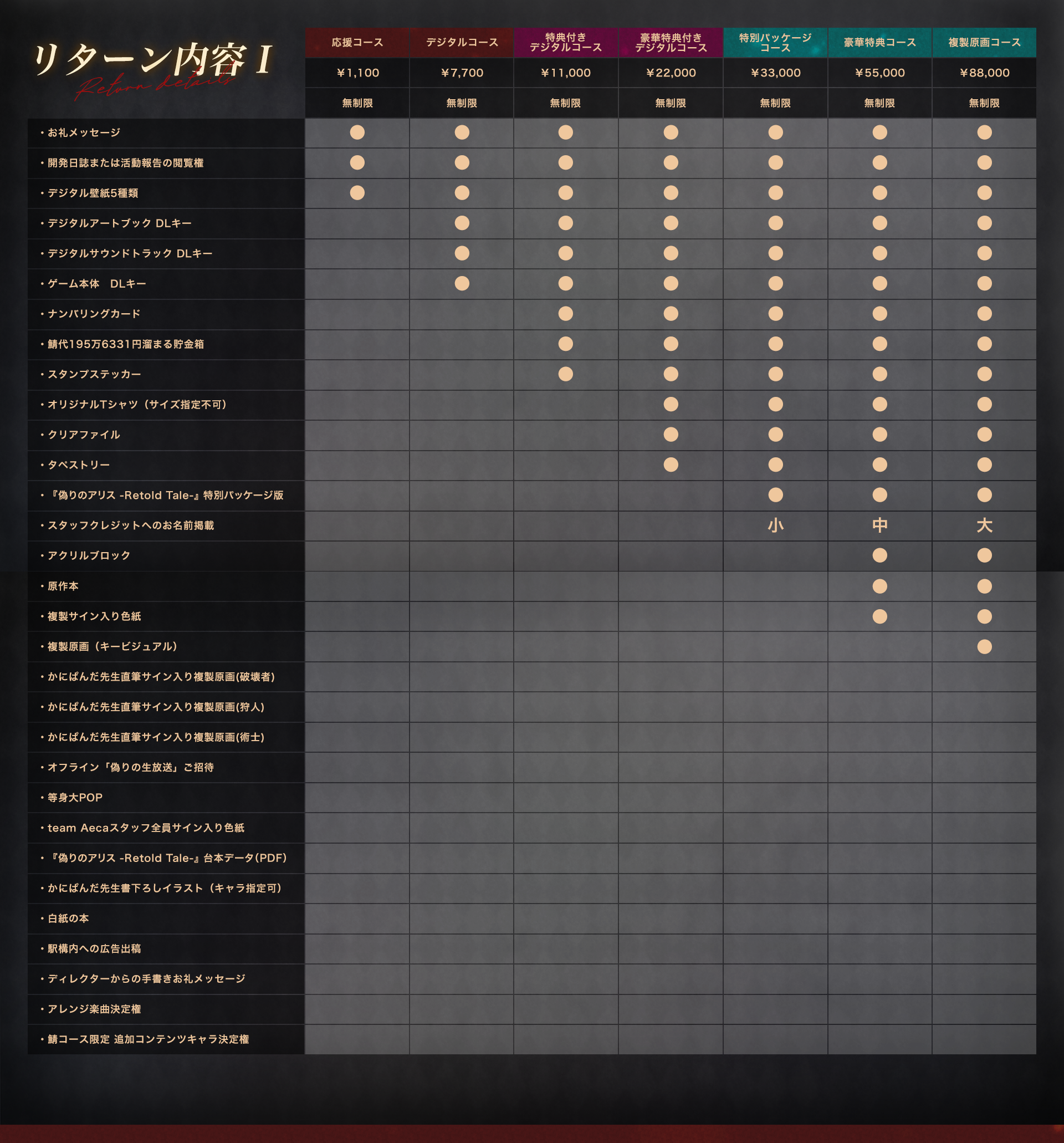 支援いただいた皆さまには、『偽りのアリス -Retold Tale-』の製品版はもちろん、デジタルサウンドトラックやアートブック、複製原画など、さまざまな形で『偽りのアリス』の世界をお届けします。