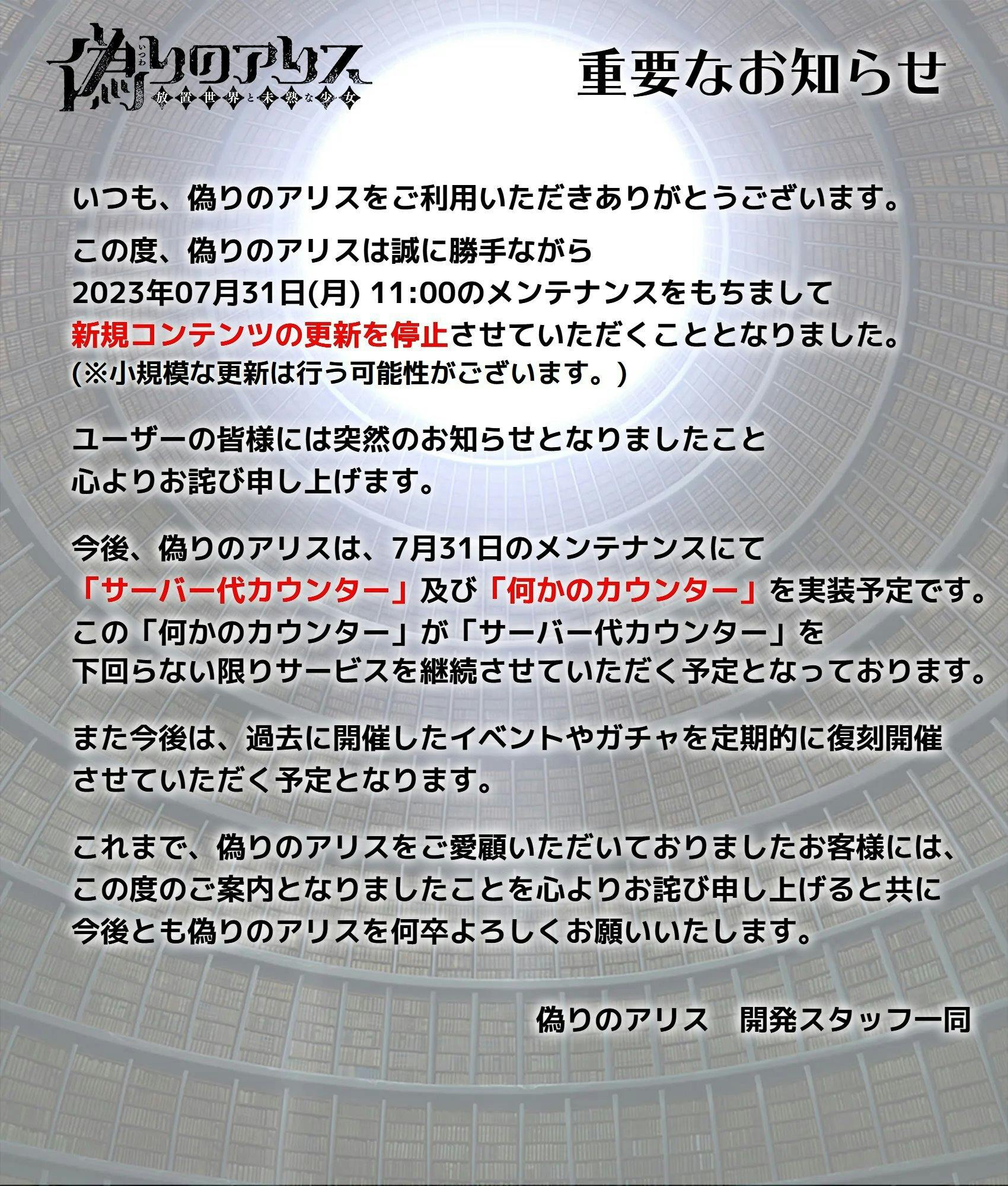 2023 年 8 月、私たちは『偽りのアリス』の更新停止を発表しました。