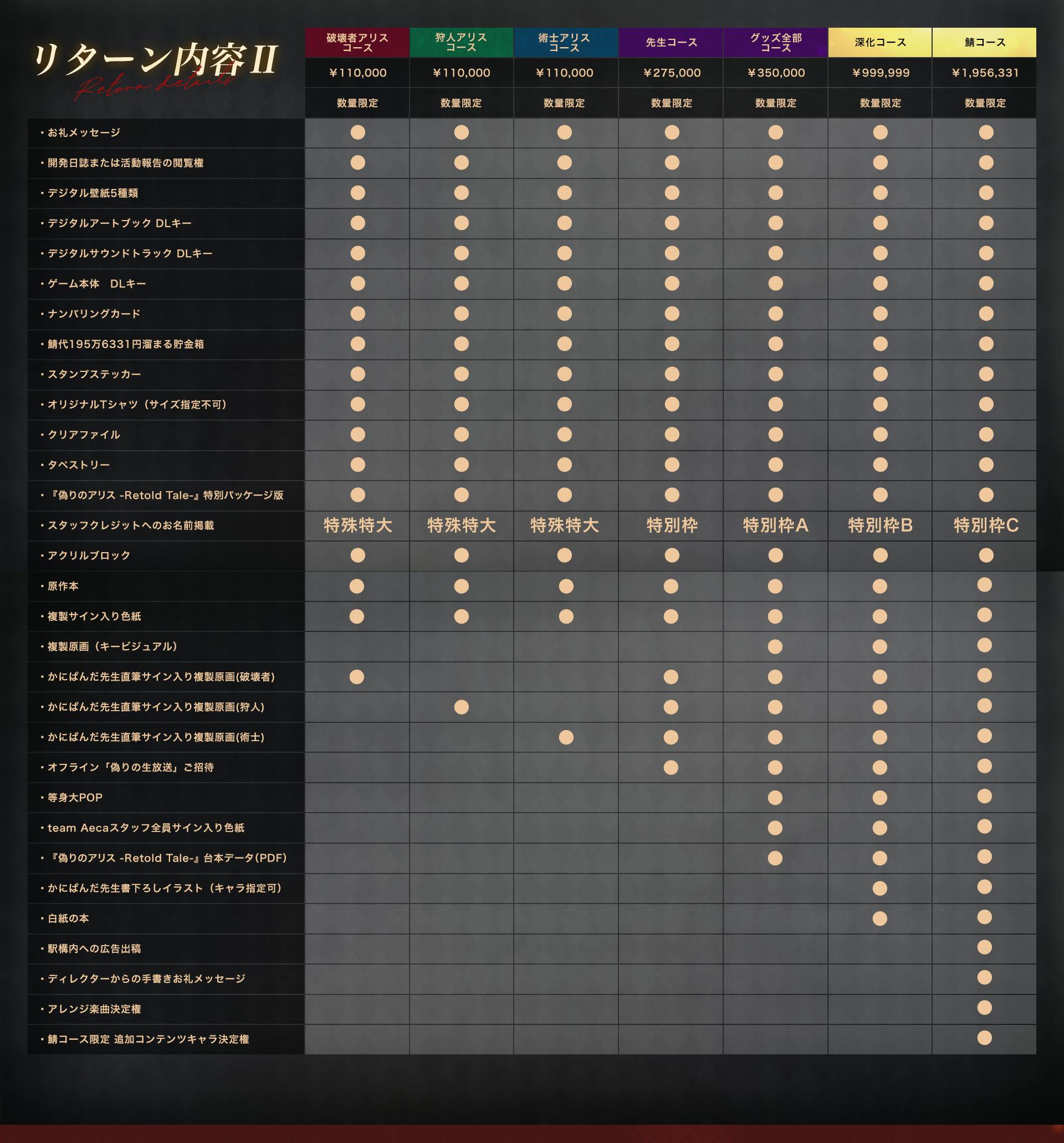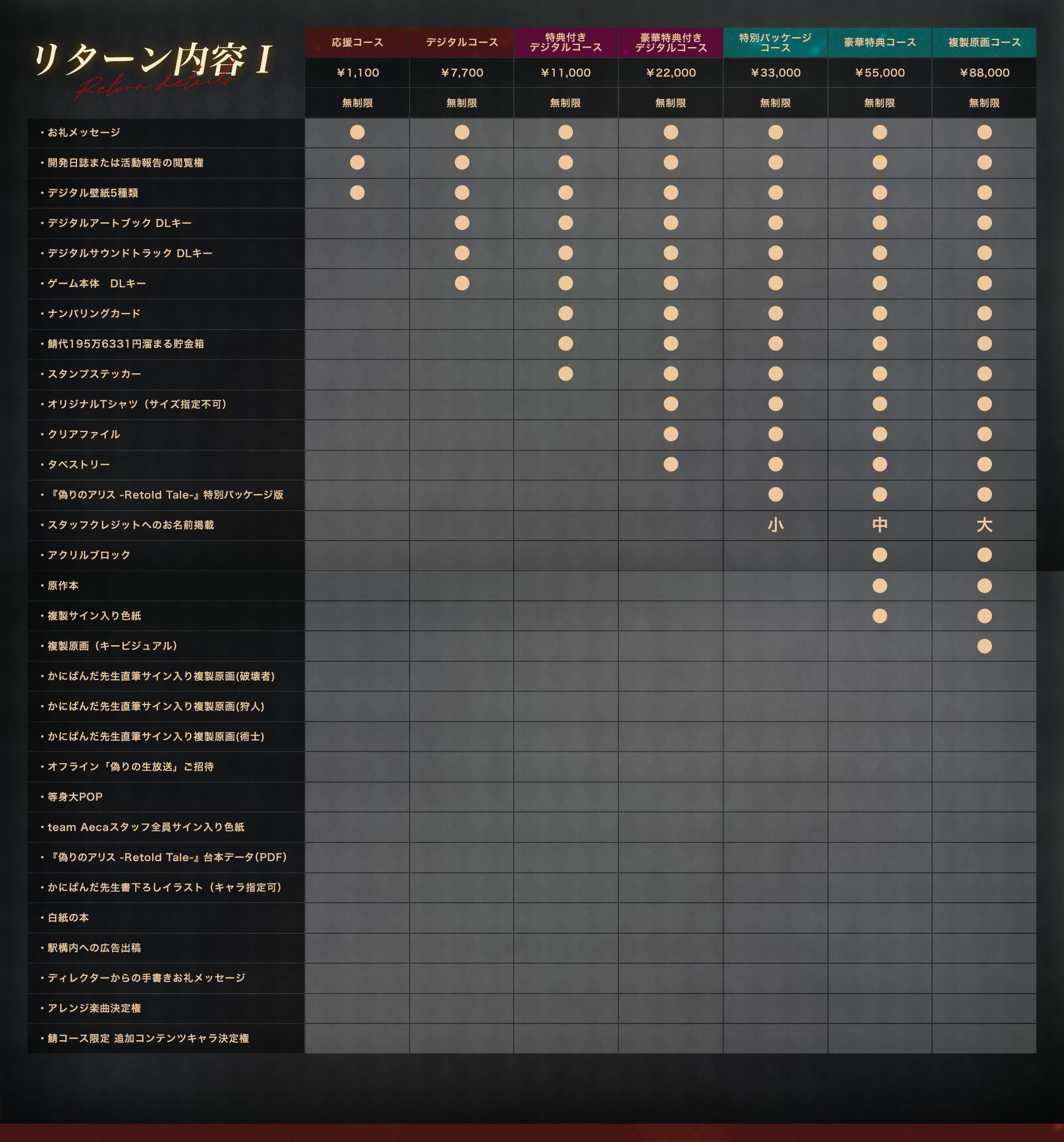 支援いただいた皆さまには、『偽りのアリス -Retold Tale-』の製品版はもちろん、デジタルサウンドトラックやアートブック、複製原画など、さまざまな形で『偽りのアリス』の世界をお届けします。