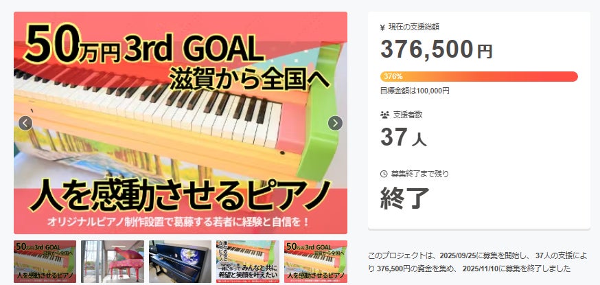 最終的に 37名の方から総額376,500円 のご支援をいただき、当初の目標を大きく上回る結果となりました。心より感謝申し上げます。