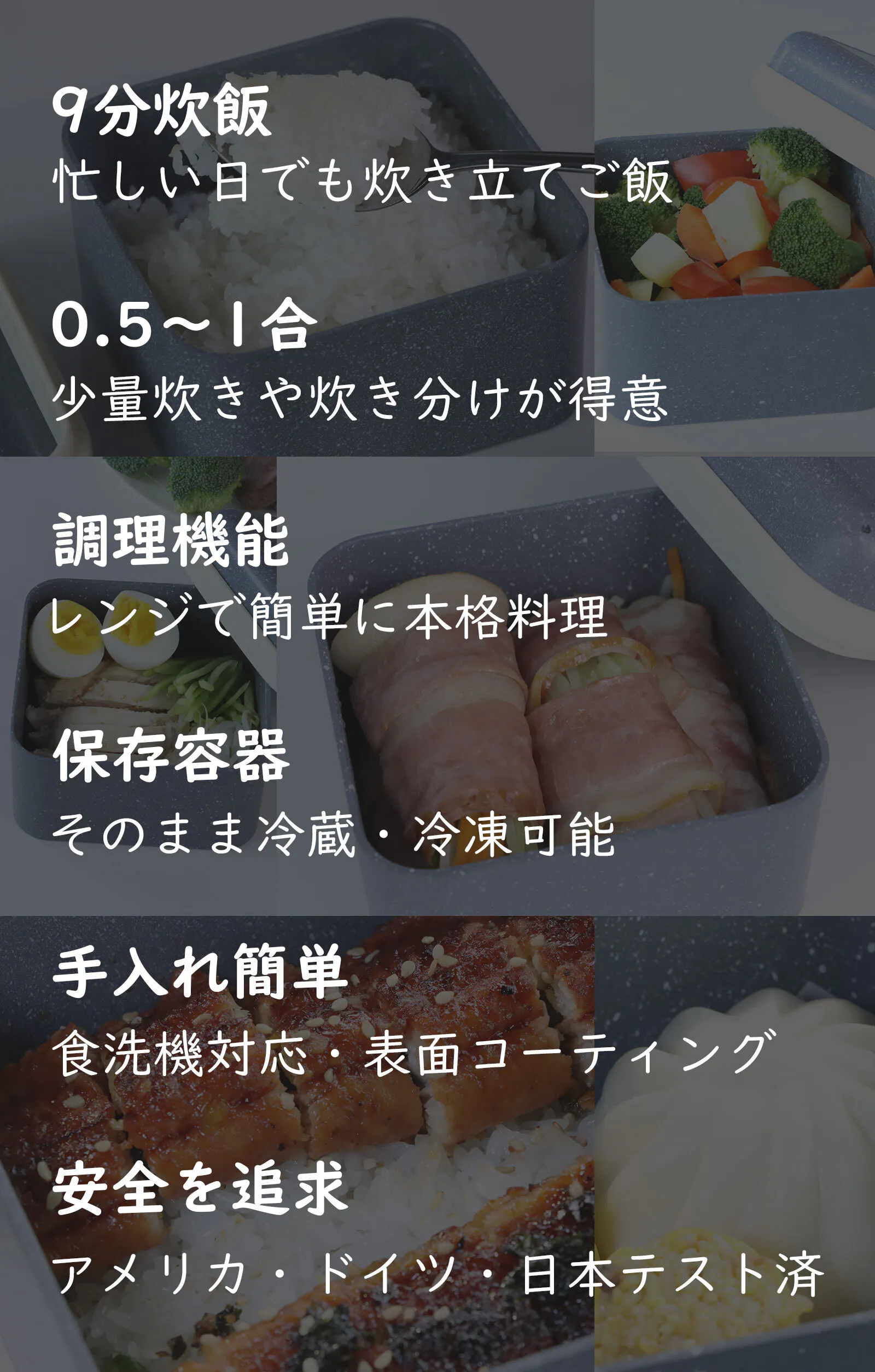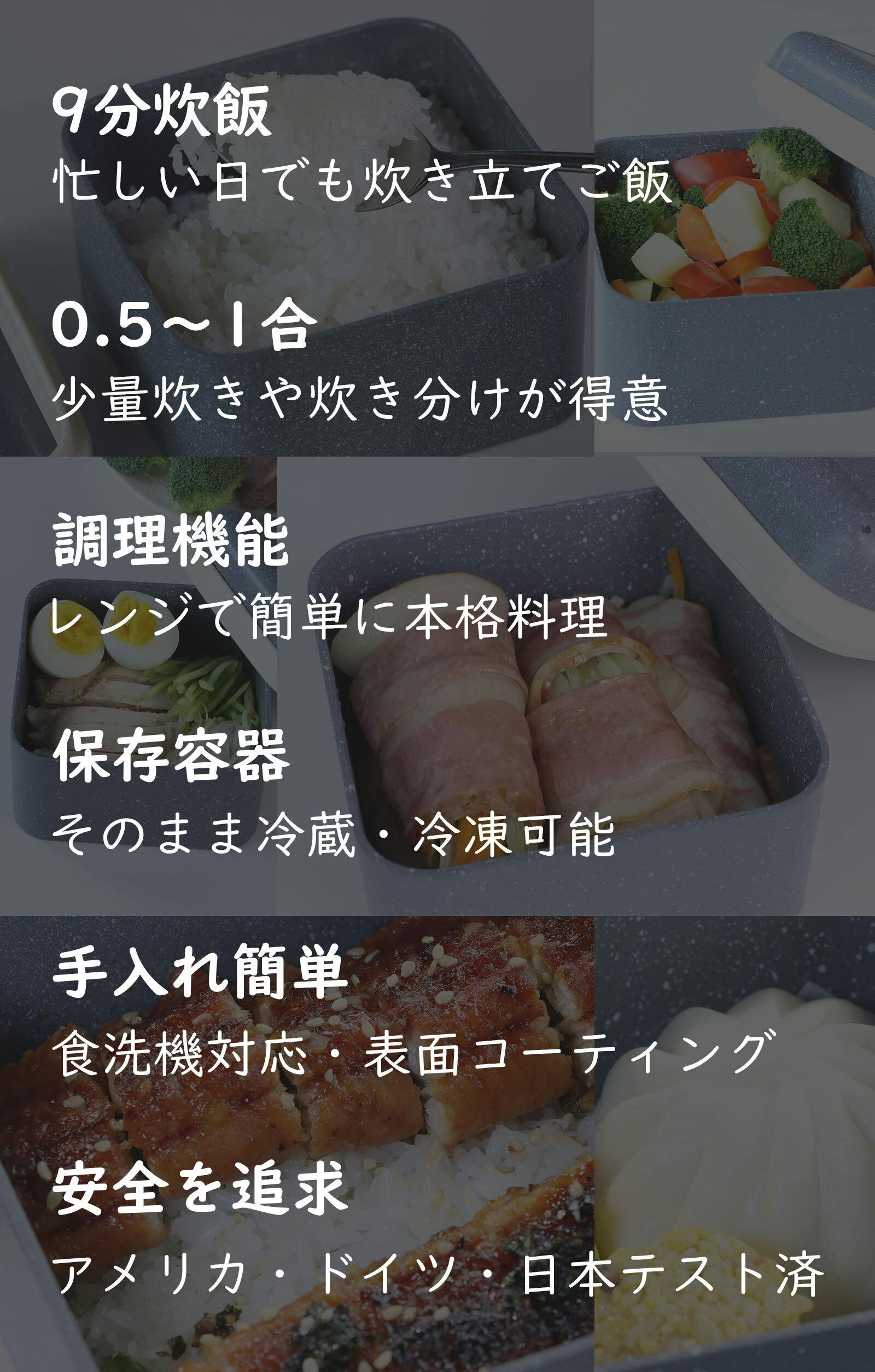 Magicook Boxは、アメリカFDA(食品医薬品局)、ドイツLFGB(食品接触材料規制)、日本食品衛生法に基づくテストをクリアし、安心してお使いいただけます。電子レンジ対応で、ご飯を炊くだけでなく、さまざまな調理や保存にも活用可能。
