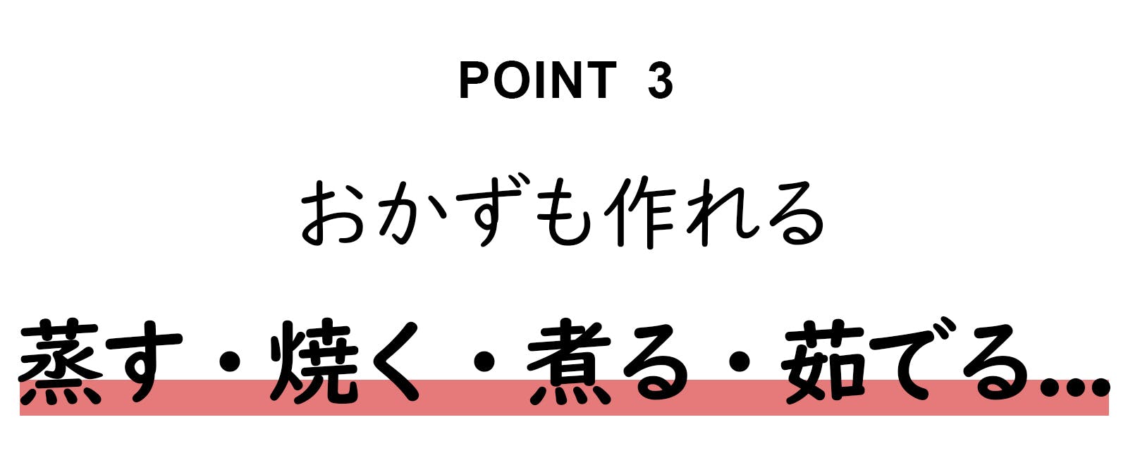 専用のお鍋や蒸籠を買わなくても、手軽にヘルシーな蒸し料理が楽しめます。余分な油を使わず、健康志向の方にぴったり。茶碗蒸しや蒸し野菜、蒸し魚など、様々なメニューがこれ1台で調理可能です。キッチンスペースも節約。