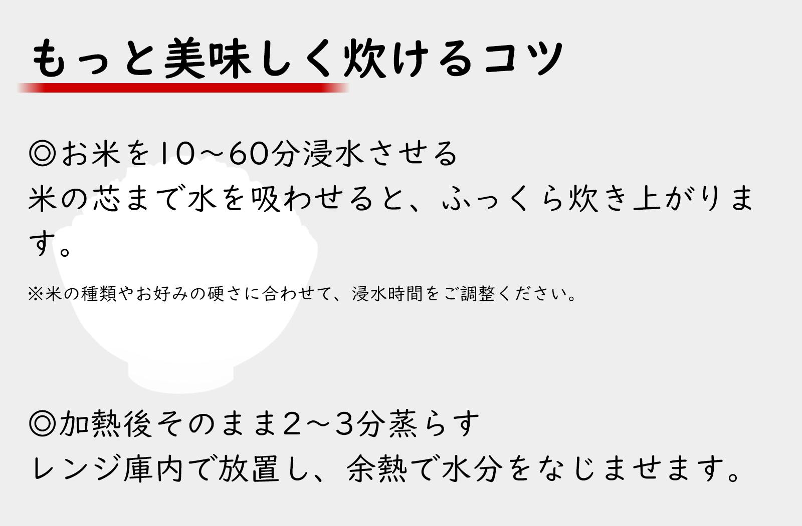 レンジの性能、お米の種類、浸水時間などによって加熱時間は変わってきます。