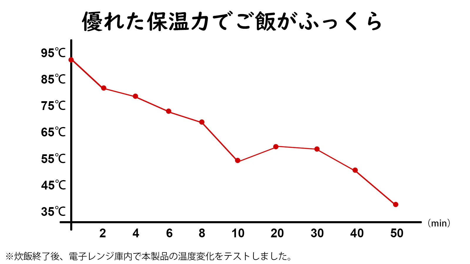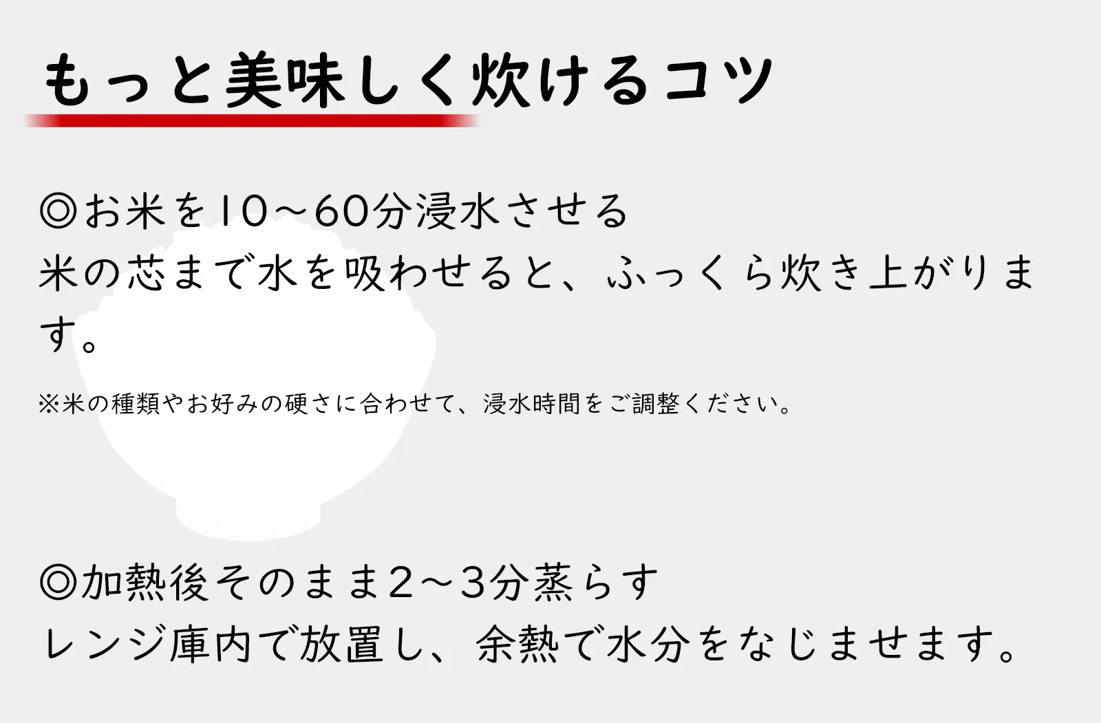 優れた保温力を持ち、加熱終了後そのまま庫内で2~3分間蒸らして、ふっくらツヤツヤに仕上がります。