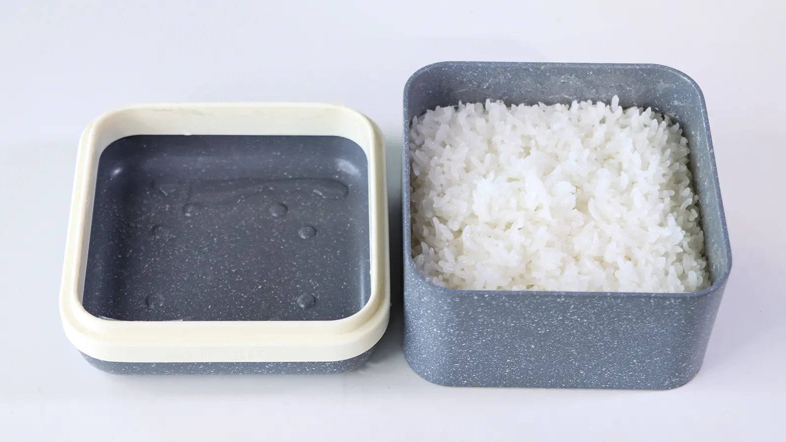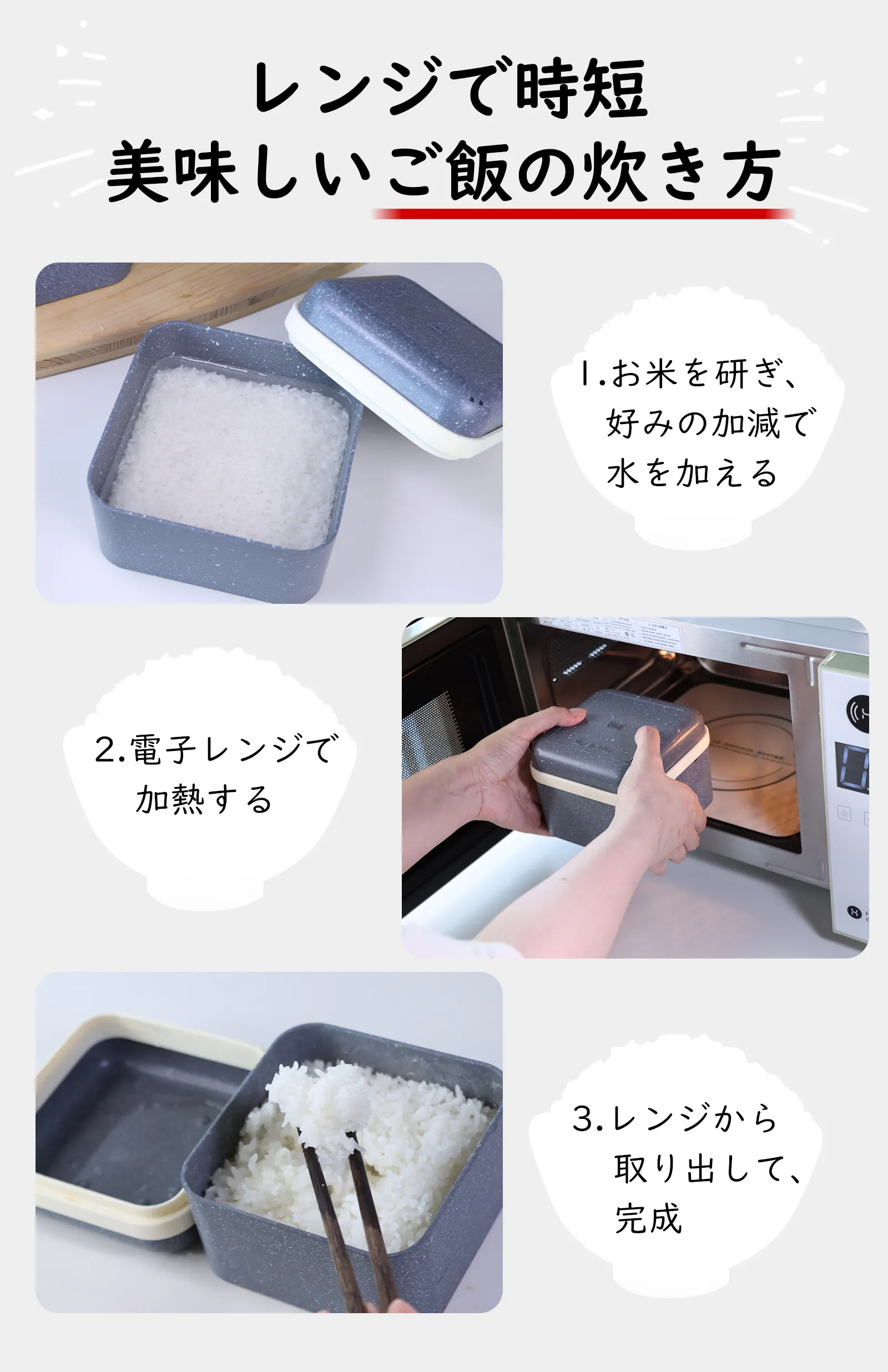 A3. Magicook Boxは効率に優れ、浸水、蒸らしなしでも美味しいご飯が炊けます。900Wレンジの場合は1合のご飯が最短9分で出来上がります。余裕がある場合は浸水、蒸らしをしてより美味しく炊けます。電子レンジの性能やお好みの加減に合わせて加熱時間をご調整ください。