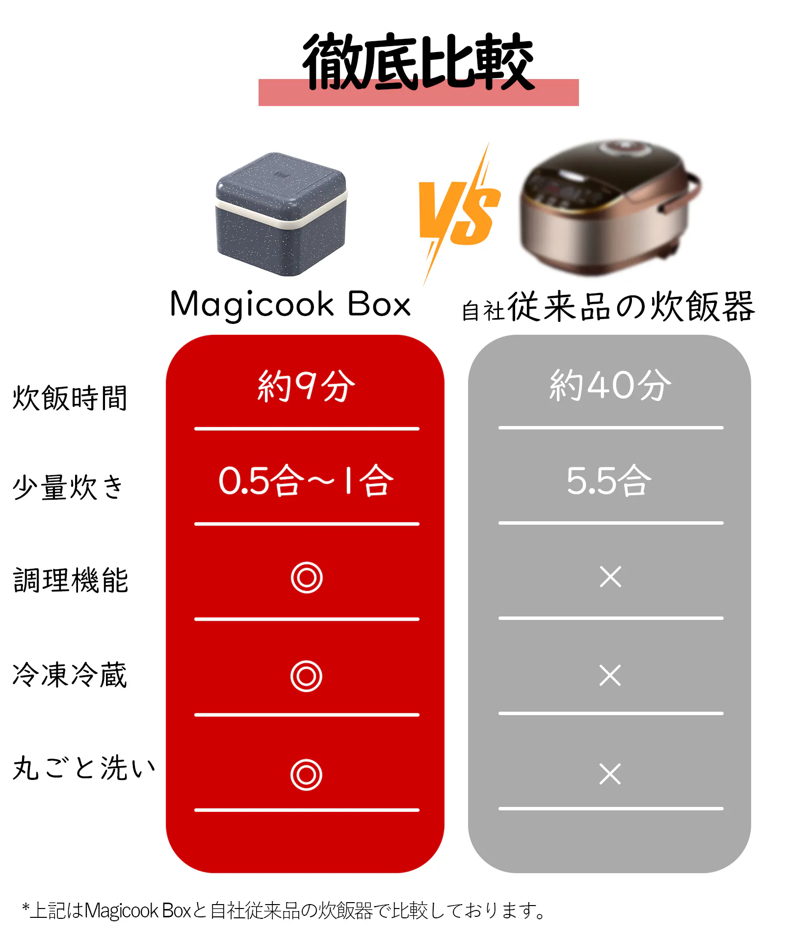 Magicook Boxの独自加熱技術が、炊飯の常識を変えます!電子レンジでたった9分、自社従来品の炊飯器に比べ約80%も時間短縮!「食べたい!」と思った瞬間から炊き始められます。