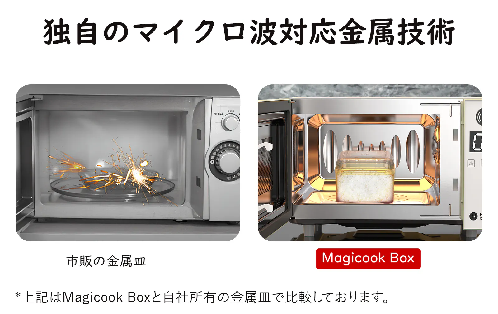 Magicook Boxは独自の「マイクロ波対応金属技術」を採用、金属部品を含みながらもマイクロ波を均一に拡散。局所的な電磁波集中を防ぐことで、火花発生を防止する安全設計を実現しています。