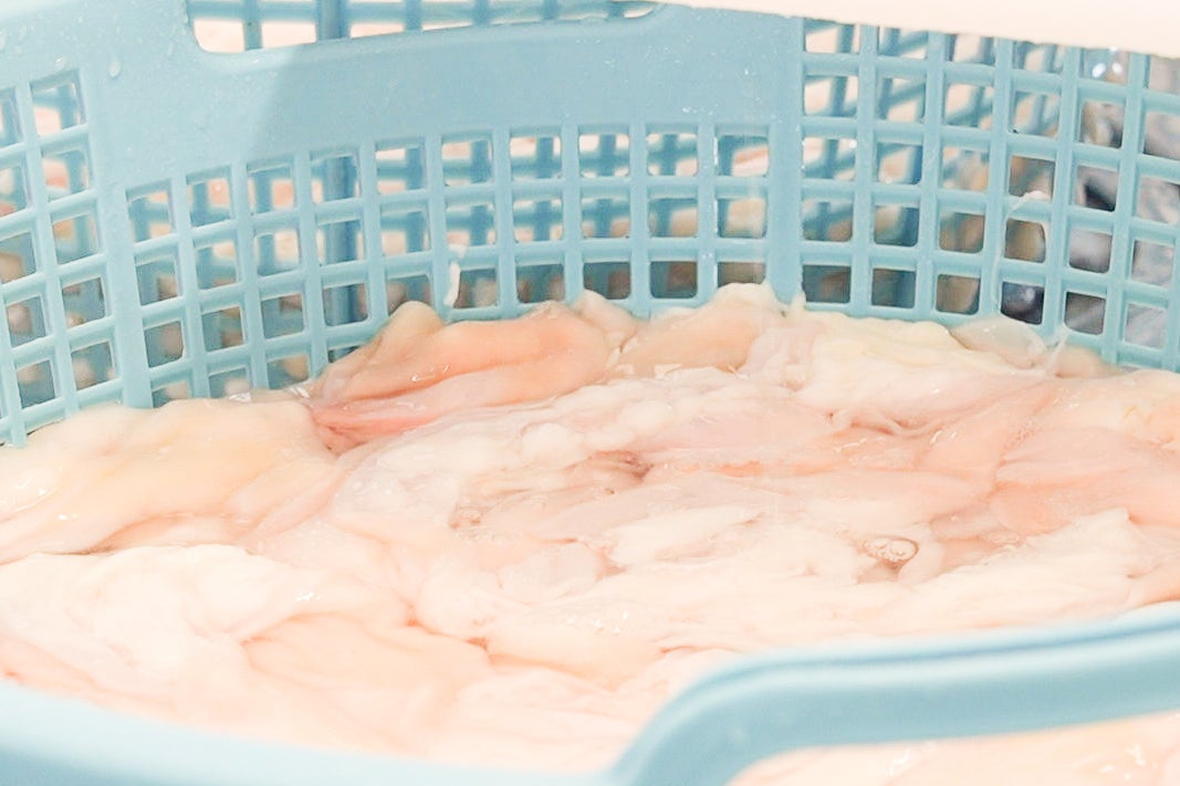 工場での、ホルモンの下処理。