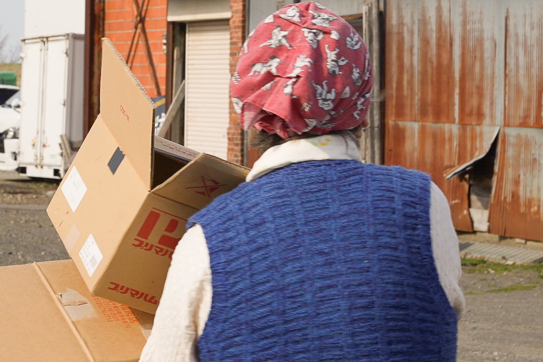 おばあちゃんは、店から工場へ移動するほんの少しの間でも、必ず何かを手に持っています。