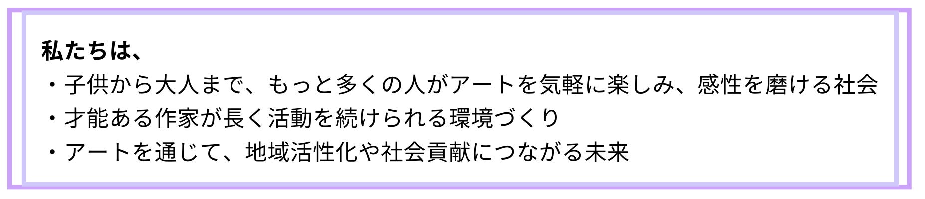 だからこそ今、「アート体験の普及」と「アーティスト支援」の両軸から、多くの人が気軽にアートを楽しめる場を広げ、埋もれてしまっている素晴らしい作家たちをもっと多くの方に届け、作家が安定した収入を得て、創作に専念できる環境を整えることで、アートマーケット全体の成長にも貢献していきたいと考えております。