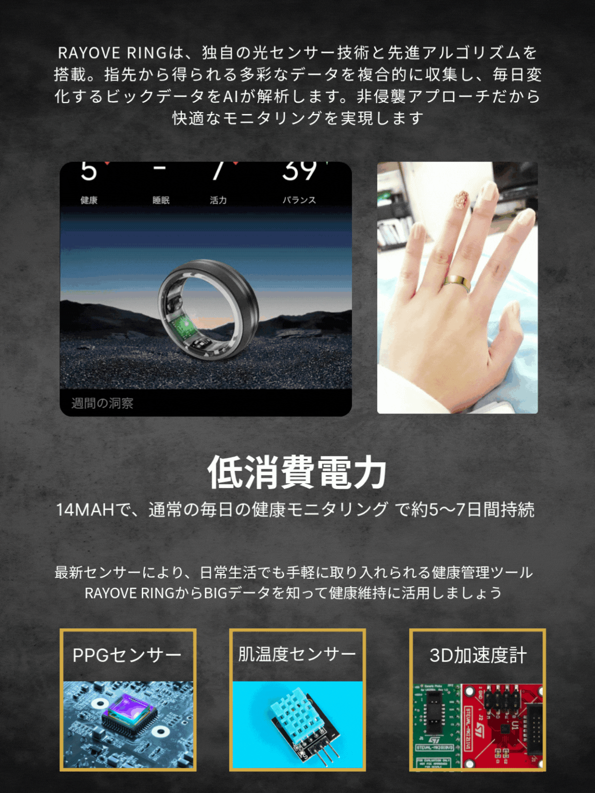 忙しいあなたにこそ必要な“体調が見える”。Rayove Ringで手間なく毎日チェック。仕事のパフォーマンス向上にも