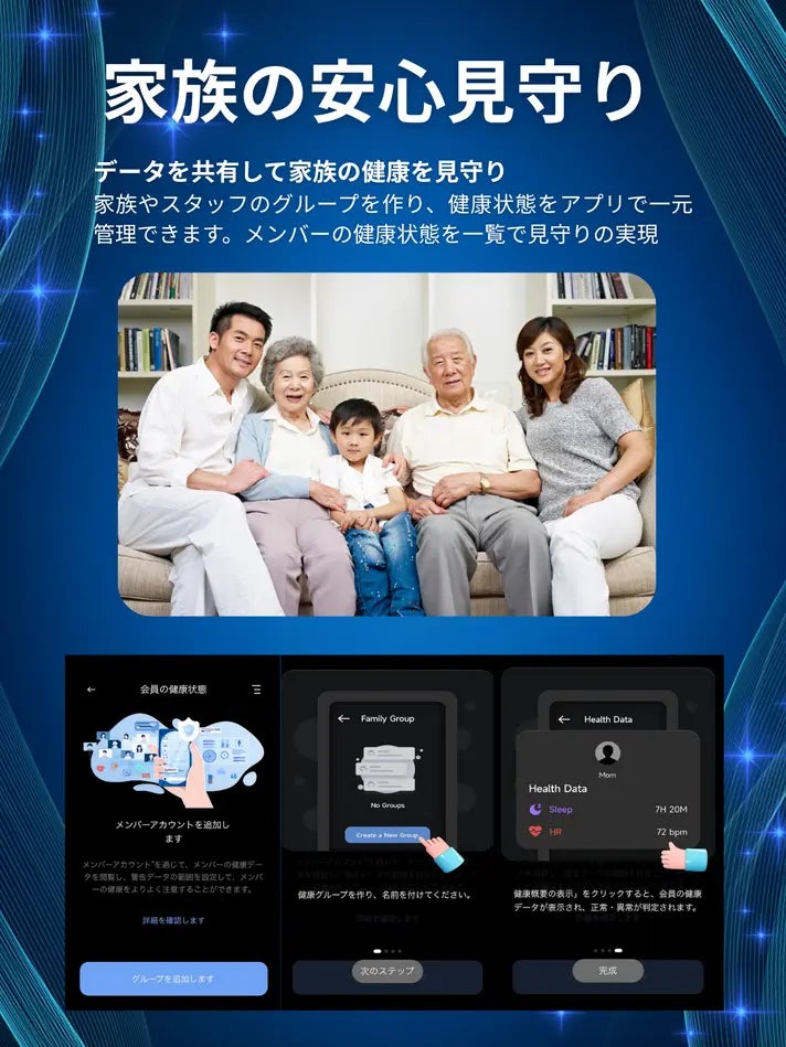 離れている家族の健康をアプリでどこでも見守れる!最新光学センサーとAIアルゴリズム※本製品はウェルネス・フィットネス用途であり、医療機器ではありません。診断・診療目的には使用できません。