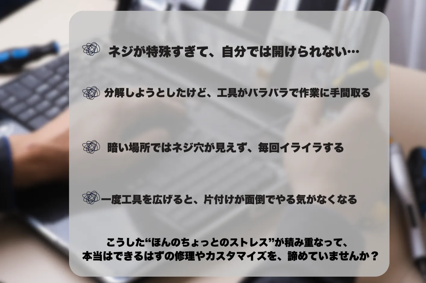 → パソコンの裏蓋を開けて中を触る作業は、精密ドライバーが必須。本製品なら、電動の200rpmで素早くネジを外し、手動でしっかり締め直すことができ、効率抜群。