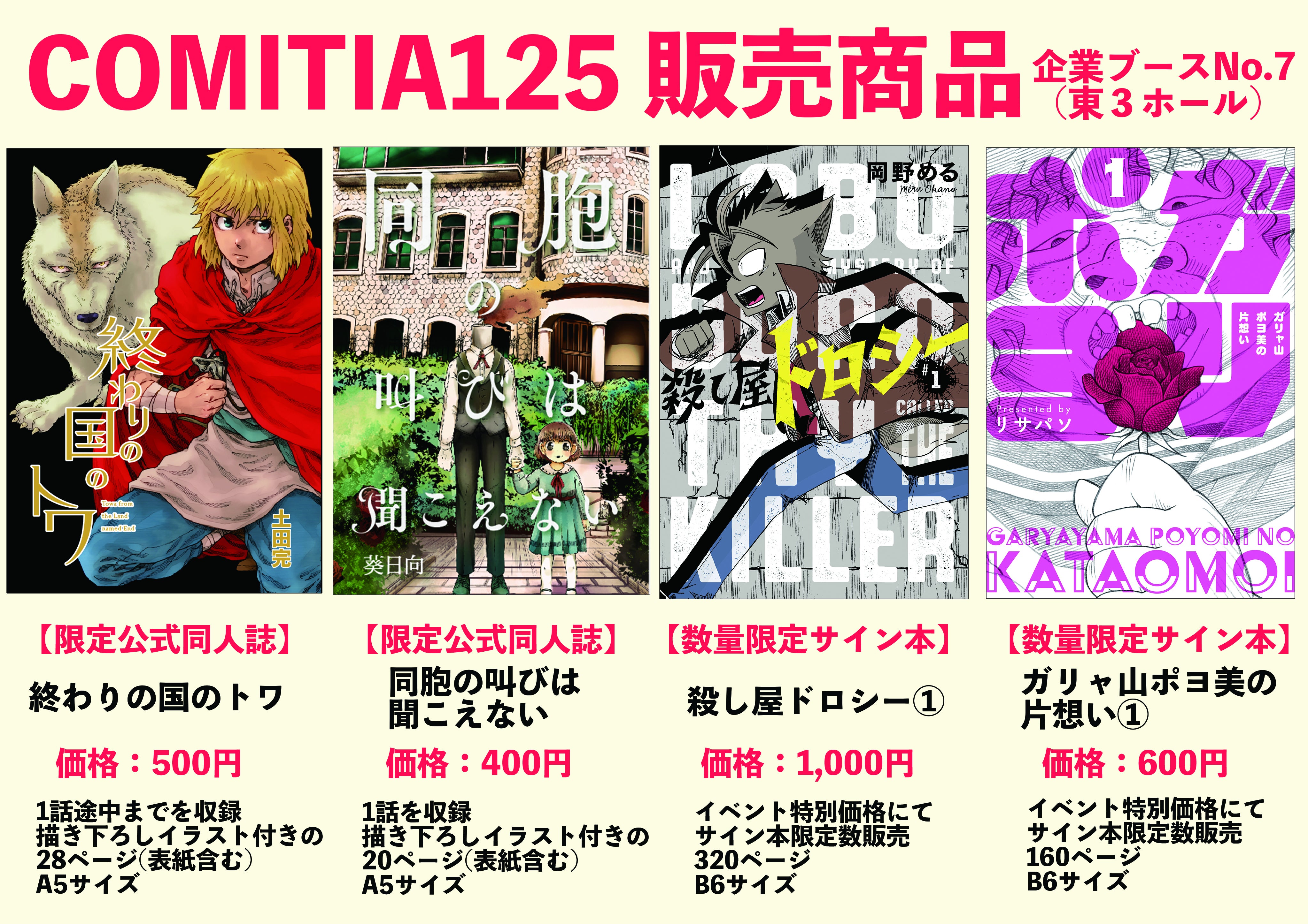8/19(日)に東京ビッグサイト東2・3ホールで開催されるCOMITIA125の企業ブースNO.7「マンガハック」にて、「終わりの国のトワ」限定公式同人誌を販売いたします。