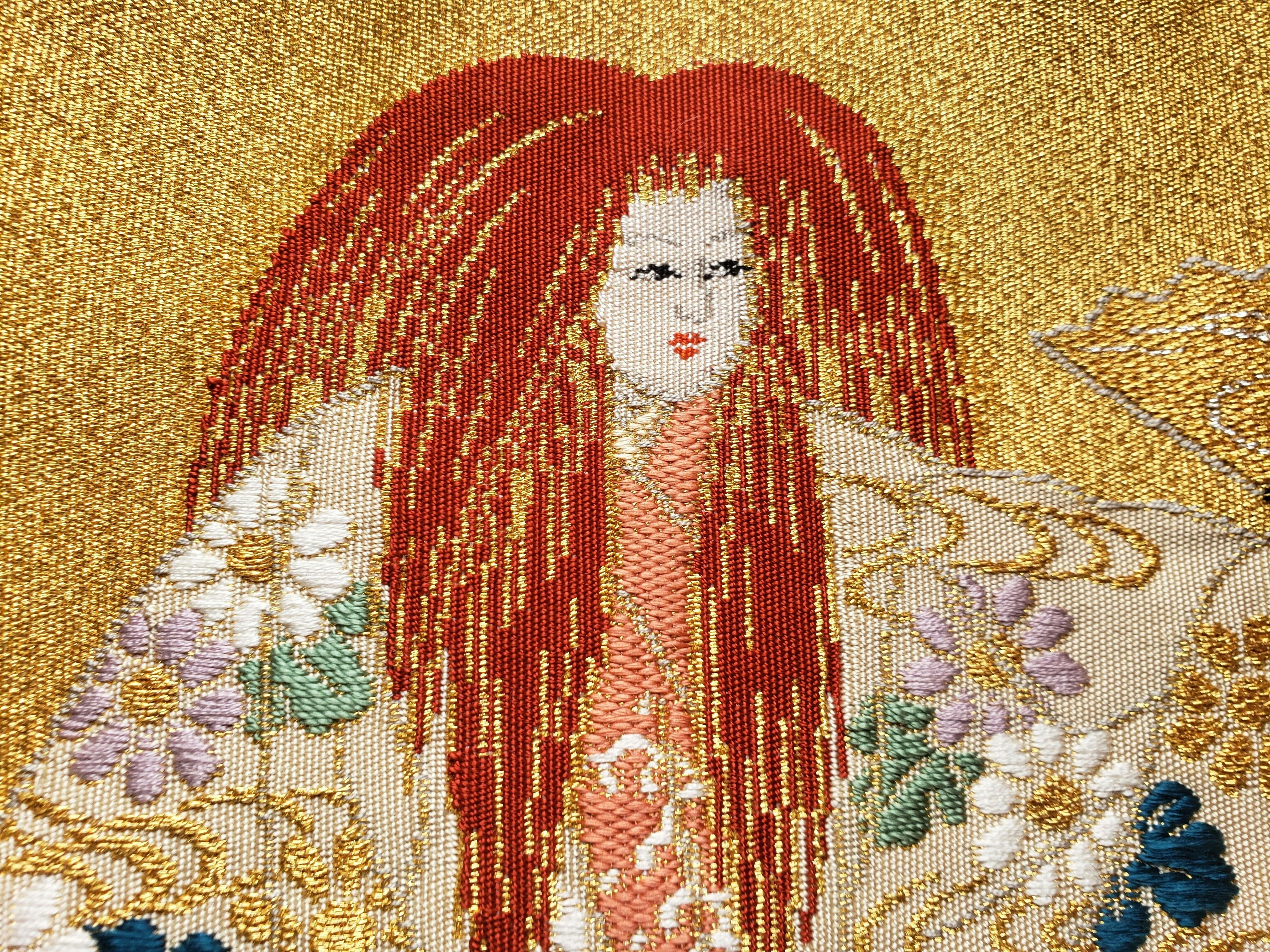 つづれ織りは刺繍でなく、織りによって絵柄を作ります。その為、耐久性があり厚みがあります。つづれ織りの帯は堅い為、自分では締められません。京都の舞妓さんのだらり帯はつづれ織りなので、動いてもめくれたりせず、優雅なそして豪華な雰囲気がかもし出されるのです。