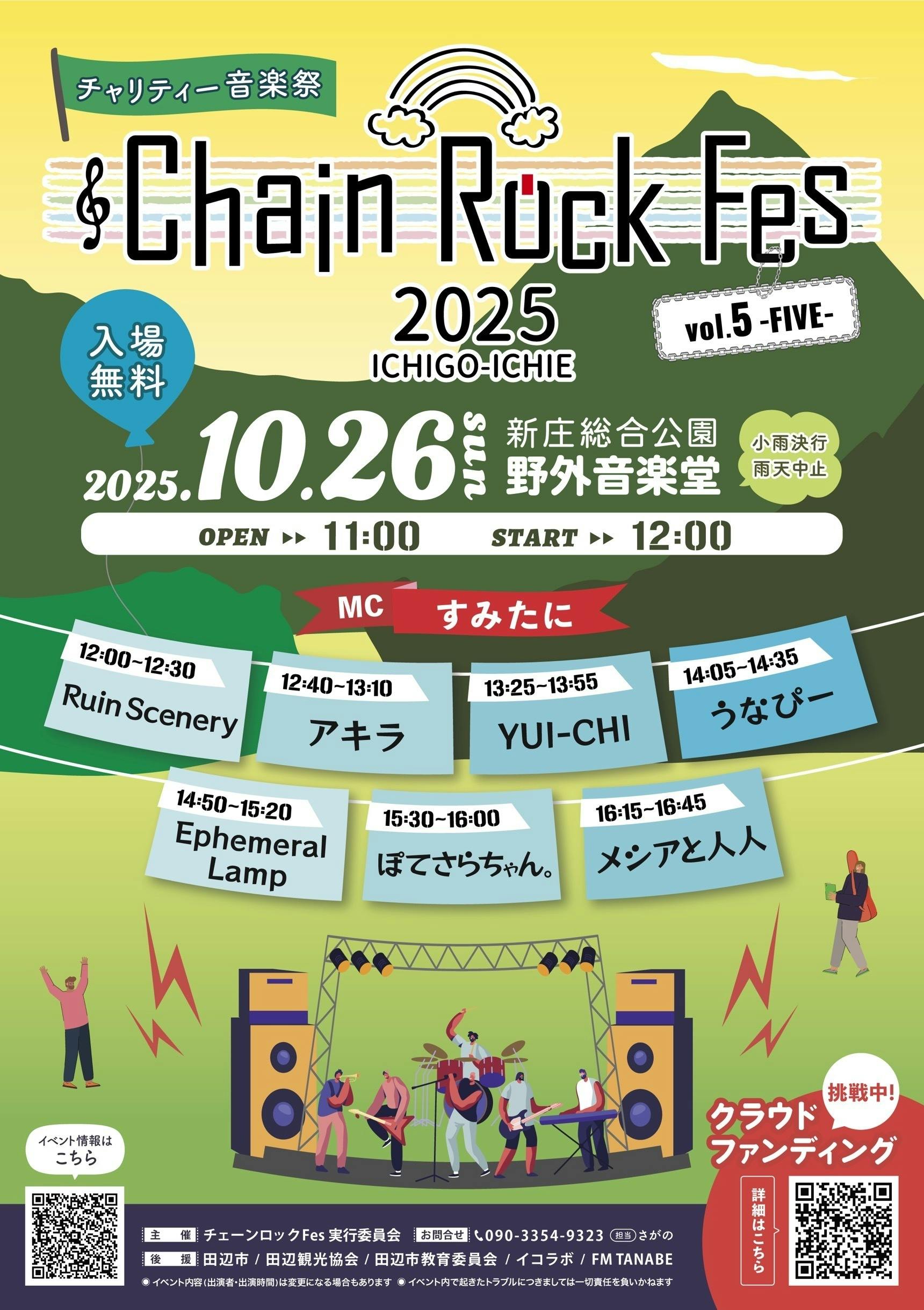 今年は、10月26日(日)に 「チェーンロックFes vol.5 -FIVE-」を開催します。(雨天・荒天中止。小雨決行。実行委員の判断による)