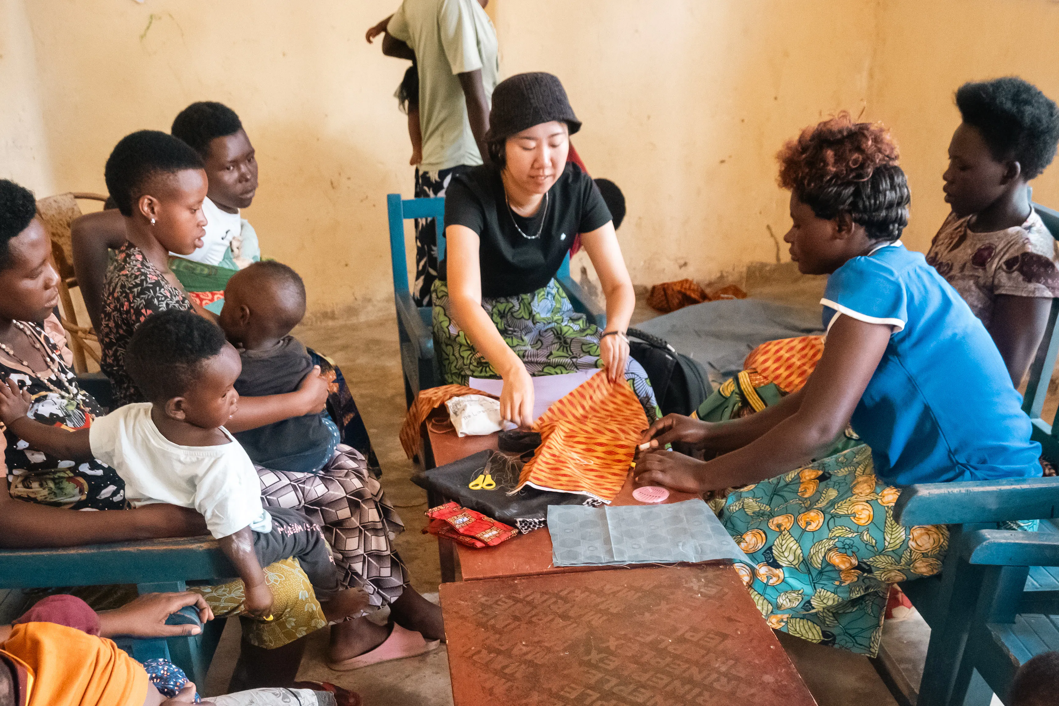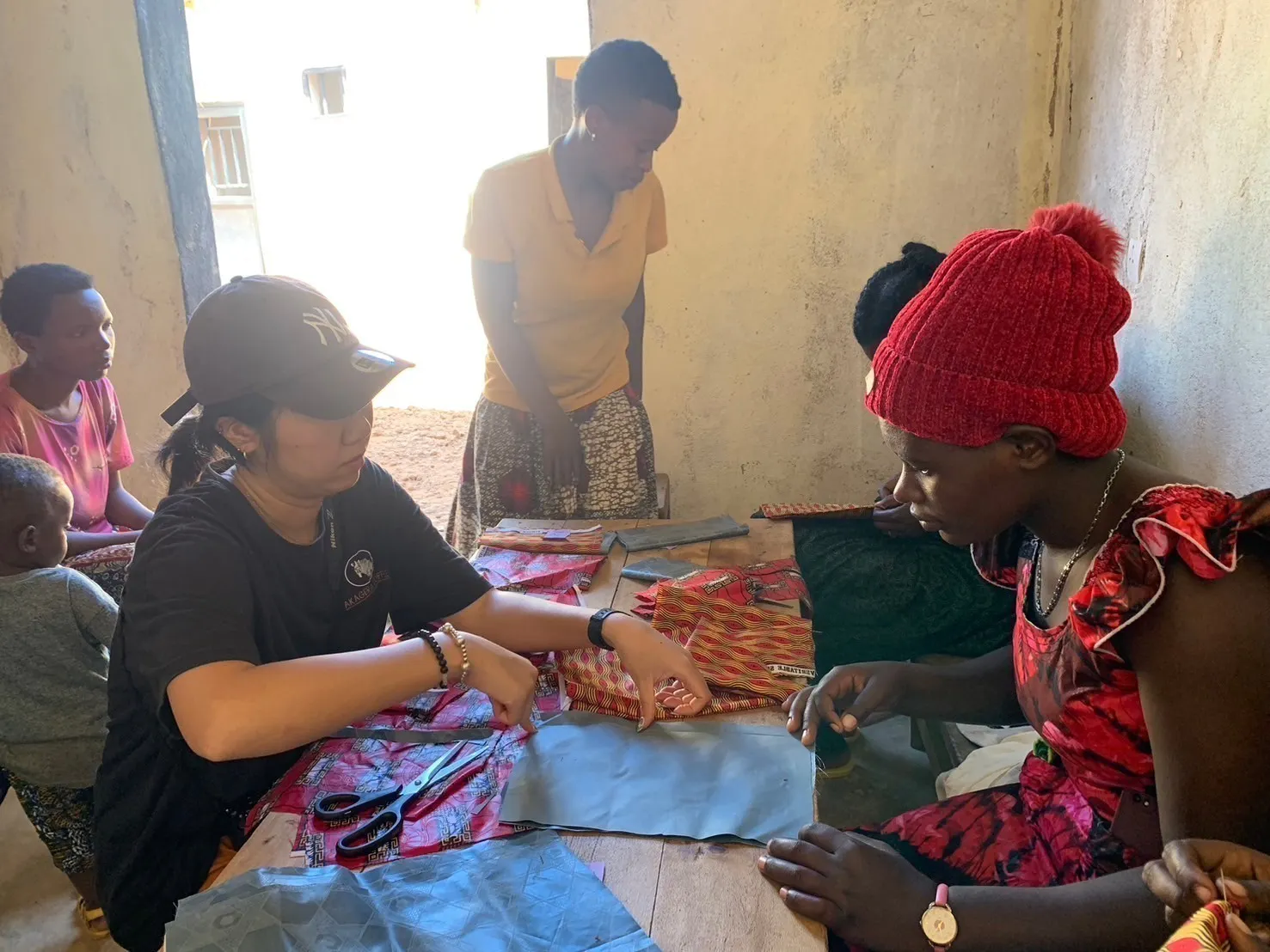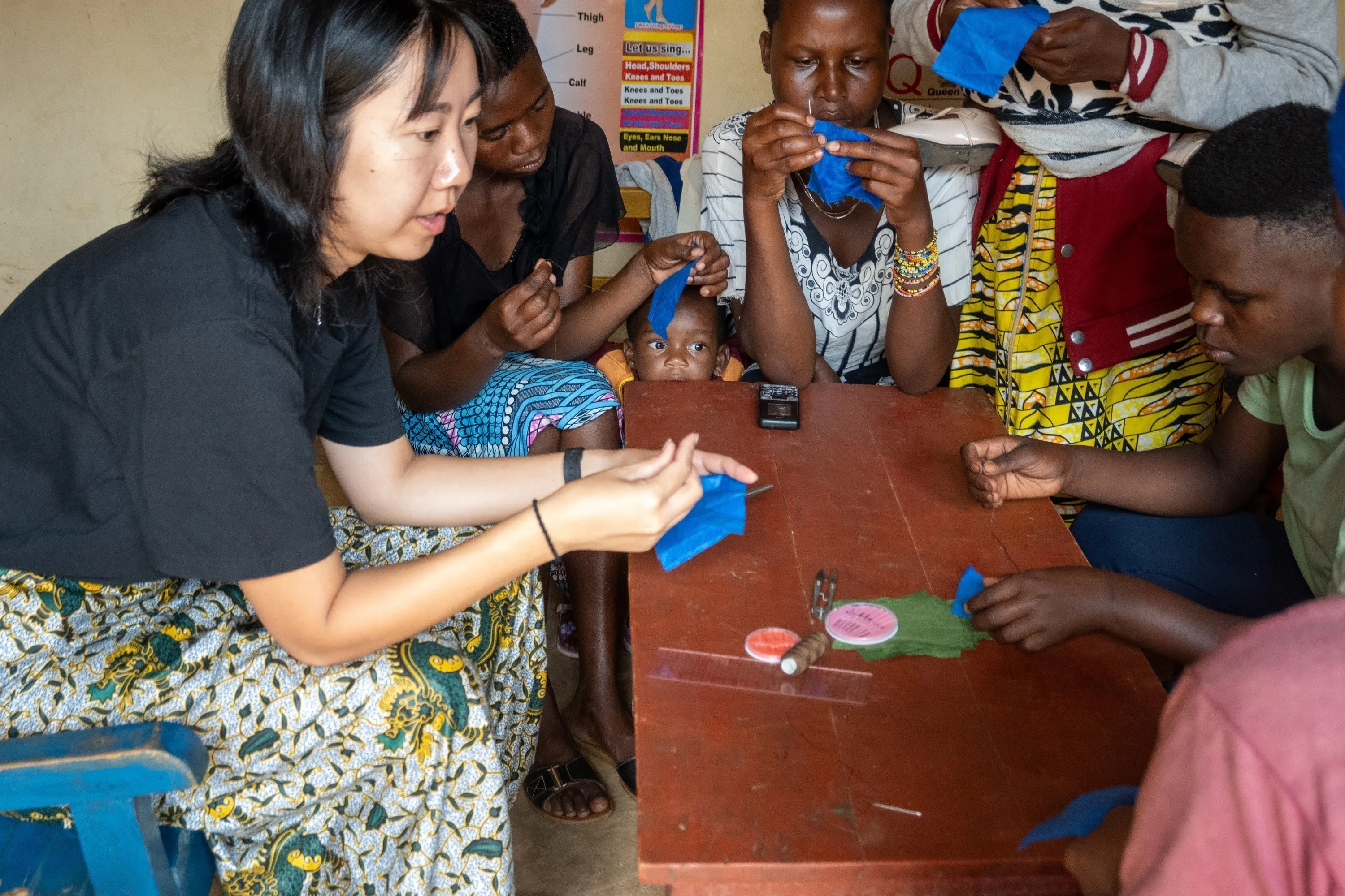 まず、私は彼女たちに手縫いの方法を教えました。