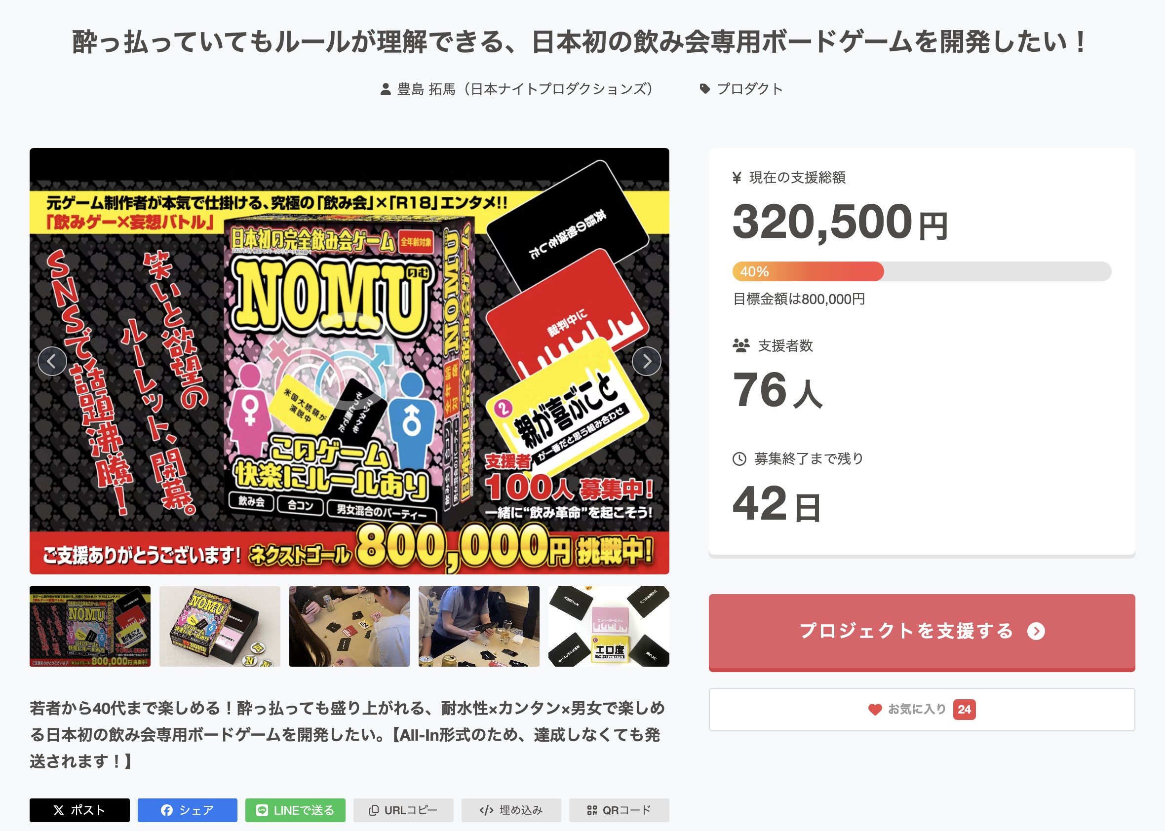 2025/07/27 21:04クラウドファンディングが、皆さまのご支援のおかげで目標金額の40%を突破いたしました!誠にありがとうございます。「日本初の飲み会専用ボードゲーム」として、皆さまの期待を超える盛り上がりを目指し、引き続き開発・広報・営業に全力を尽くしてまいります。応援コメントやSNSでのシェアが何よりの励みになっています。リターンも随時追加予定ですので、引き続きご注目ください。引き続きのご支援・ご協力のほど、どうぞよろしくお願いいたします。 もっと見る
