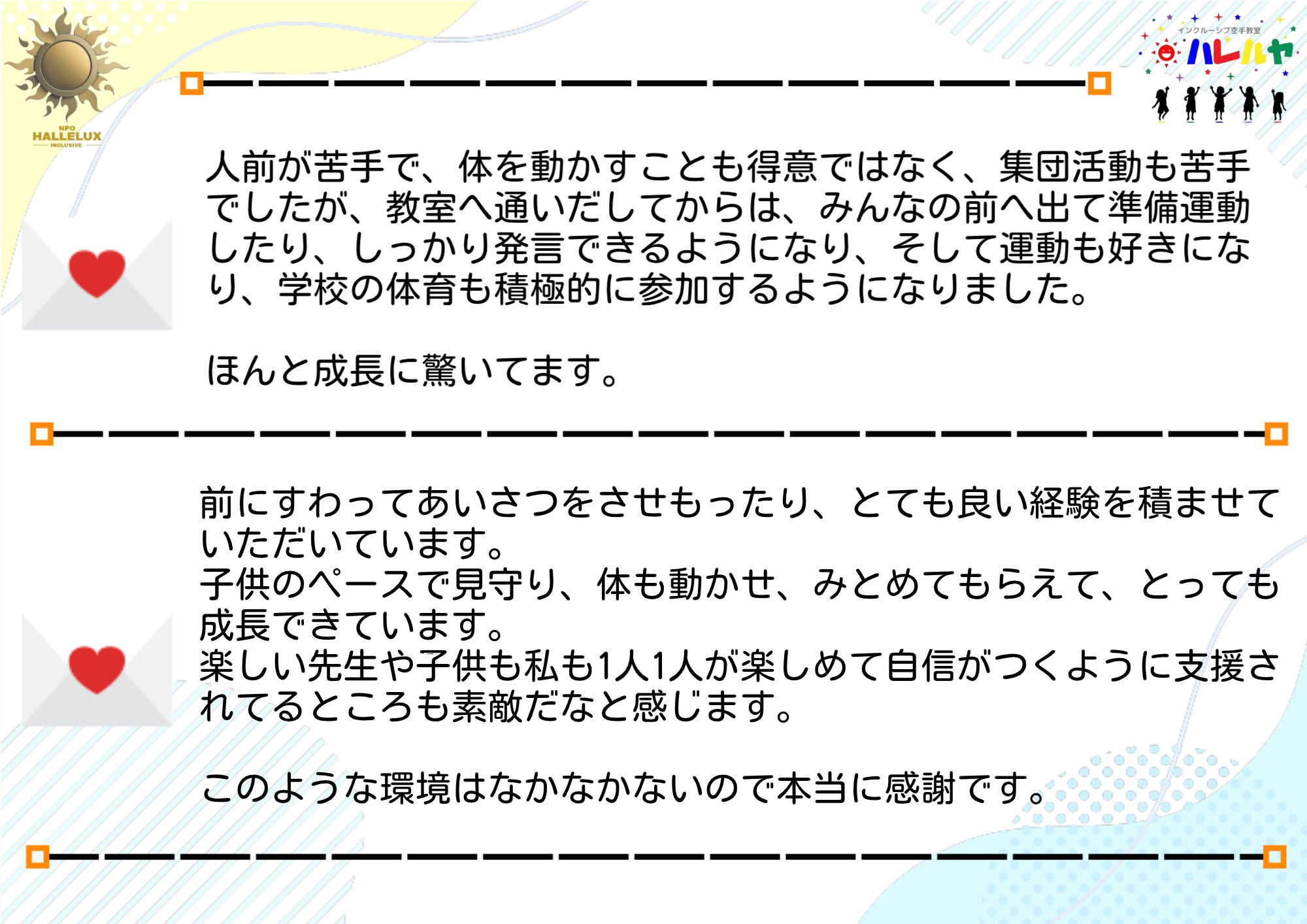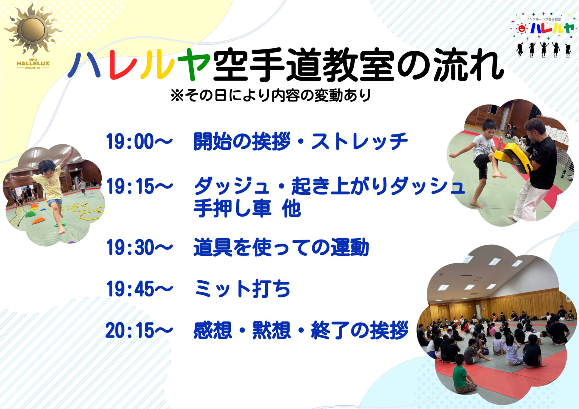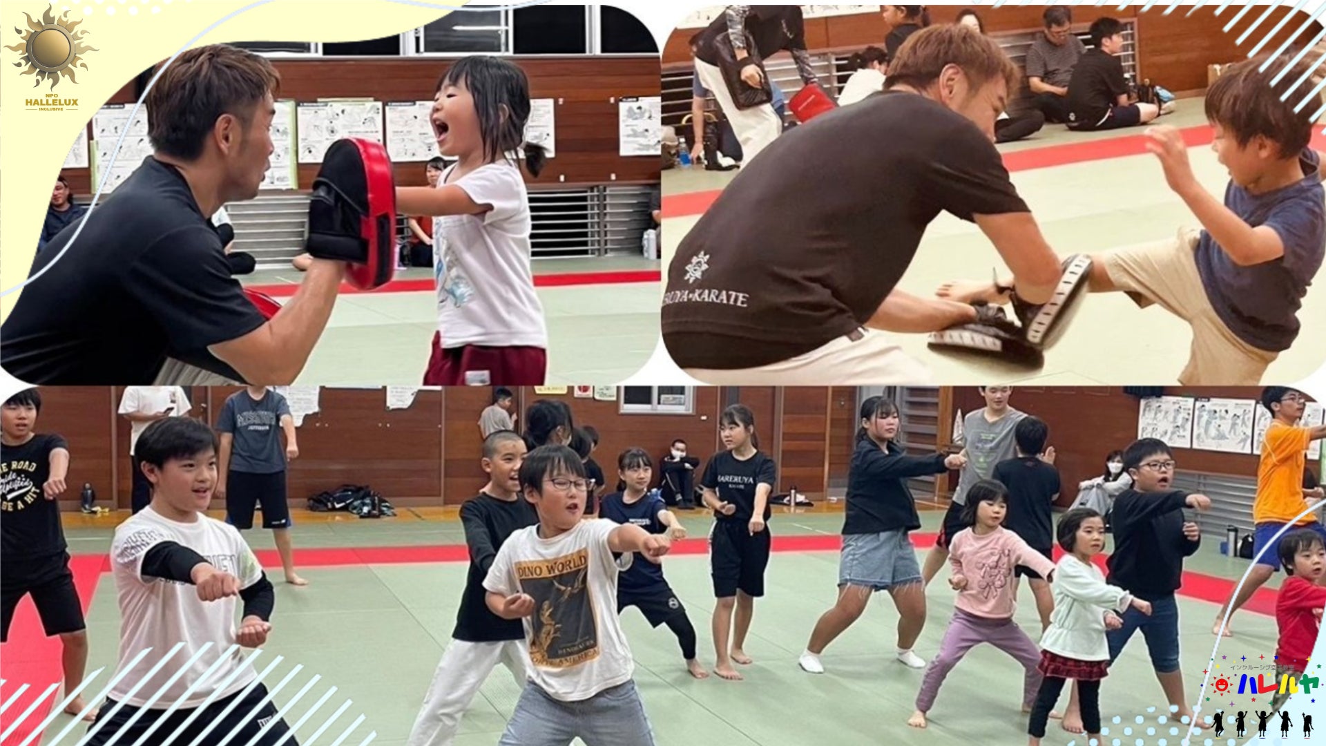 ハレルヤ空手道教室では、発達に特性があるお子様や不登校、運動が苦手、集団生活に不安を持つお子様を含め、全ての子どもたちが参加可能なインクルーシブな運動教室です。 運動を楽しむ中で「できた!」という成功体験を重ね、子どもたちが「挑戦すること」を怖がらず、自信を育むと共に、協力や共感の心を育成しながら成長できる「最高の環境作り」を進め、すべての子どもたちが安心して笑顔で過ごせる社会の実現に向けて、日々取り組んでいます。
