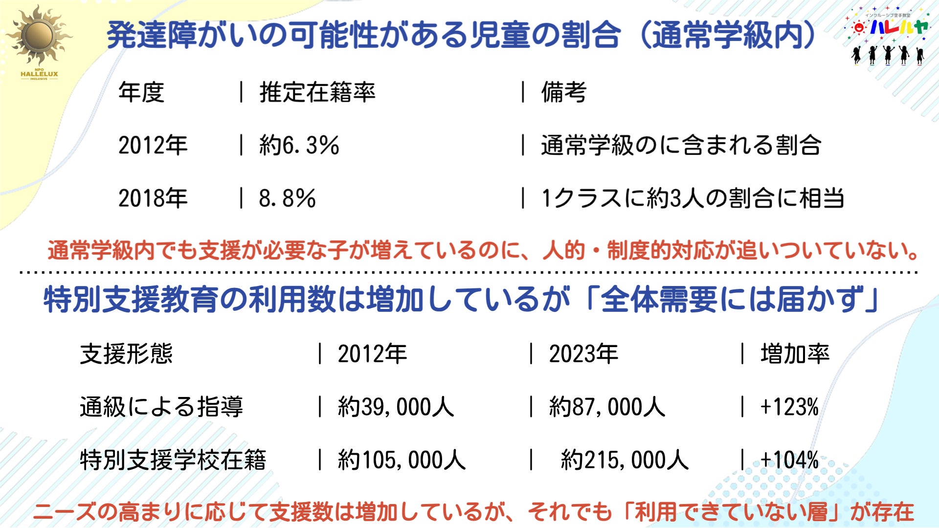 NPO法人ハレルクスは、発達に関する障がいの有無にかかわらず、すべての子どもたちが孤立することなく共に成長し、さまざまなことに挑戦できるインクルーシブな環境を提供し、子どもたちの将来を支援することを目指しています。