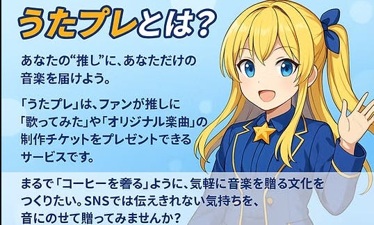 「推しの誕生日にオリジナルソングを贈れたら…」「推しにもっと歌を出してほしい…」そんな夢を叶える、ファンから“推し”へ歌のプレゼントを贈れるサービスを立ち上げます。