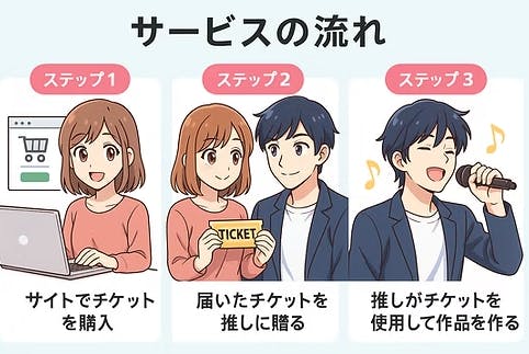 このプロジェクトでは、歌ってみた・オリジナル曲の制作チケットを購入し、推しにプレゼントできる仕組みを構築します。
