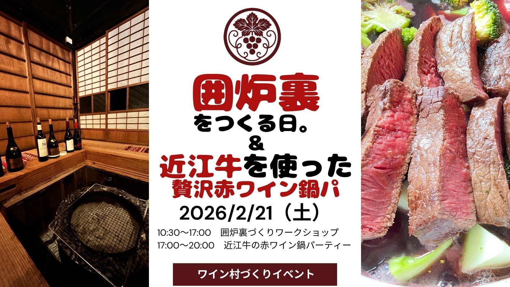 2026/01/16 15:052026年、ついにワイン村の物語が“現実”として動き出します。その記念すべき第一歩が――『囲炉裏をつくる日。〜夜は近江牛赤ワイン鍋で完成祝い!〜』です。クラファンで語ってきた夢を、一緒につくるイベントとしてスタートさせます。ワイン好きの夢を叶えるワイン村づくりプロジェクト(CAMPFIRE)https://camp-fire.jp/projects/867820/view このイベント、ここがたまらない!5つの魅力【1】 一生モノの思い出になる「囲炉裏づくり」を体験古民家に囲炉裏をつくる瞬間に立ち会えるなんて、人生で何回あるでしょう?完成した囲炉裏は、これからのワイン村の象徴になります。【2】 囲炉裏づくりワークショップは《参加費無料&賄いランチ付き!》「ちょっと手伝ってみたい」「雰囲気を味わいたい」そんな軽い気持ちでも大歓迎。参加するだけでワイン村の“歴史の一部”に。囲炉裏づくりワークショップは無料で参加でき、しかも「土鍋で炊いた近江米おにぎり〜高島産佃煮入り〜」の賄いランチ付き!!【3】村びとは“好きな役割”で参加OK・囲炉裏づくり係・ランチ準備係・YouTube撮影係あなたの得意なこと・やってみたいことで関われるのが、ワイン村スタイルです。 【4】完成祝いは17時から『近江牛の贅沢赤ワイン鍋パーティー』囲炉裏が完成したら、みんなで記念撮影!!完成祝いは贅沢に!!赤ワインを使った旨みたっぷり赤ワイン鍋!当然、ワインが進む!!しかも、お肉は全てワイン村近くで仕入れた近江牛!!とろける近江牛 × 厳選ワイン5〜6種。この一体感、クセになります。【5】囲炉裏づくりに参加した村びとは《鍋パ特別価格》17時から開催する完成祝いの鍋パからのご参加も可能です!通常10,000円の鍋パが、囲炉裏づくり参加で → 7,000円!「村づくりした人ほど、得をする」それがワイン村です。“夢を語る場所”から、“夢が生まれる現場”へ。あなたと一緒に、この囲炉裏を実現したい。ぜひ、ワイン村のはじまりの日を体験しに来てください。 ───────────────────────────■ イベント概要───────────────────────────【日時】2026年2月21日(土) 10:30~17:00:囲炉裏づくりワークショップ(無料)17:00~20:00:完成祝いの鍋パ!!(有料)【集合】滋賀県高島市のワイン村集合【会場】高島ワイン村(ワインヴィレッジ高島)520-1217 滋賀県高島市安曇川町田中2447※ JR安曇川駅から徒歩23分、タクシー5分(琵琶湖側ロータリーにタクシー乗り場があります)※ 先着順で宿泊も可能です!(ご希望の場合は、詳細をご案内しますのでご連絡ください)※ 宿泊の場合は、お車でのご来場も可能です。電車が30分に1本しかないので、以下の電車をご利用ください!09:16JR京都駅発『JR湖西線新快速近江今津行』09:58JR安曇川駅着【会費】税込10,000円(鍋パからご参加の場合)囲炉裏づくり参加村びと:10,000円→7,000円クラファンご支援村びと:10,000円→7,000円WCF受講生:10,000円→7,000円お支払いは、前払いにてお願い致します。【お支払い先】paypayの場合:paypay ID: oomin銀行振込の場合:滋賀銀行(銀行コード0157)牧野支店(店番号909)普通0390140恐れ入りますが、振込手数料はご負担いただきますようお願い申し上げます。【お食事】近江牛を使った贅沢赤ワイン鍋コース!!【ワイン】ワイン村の村長おーみんが近江牛赤ワイン鍋に合わせて厳選した贅沢ワイン5〜6種【お申込み】ご予約は、こちらからお願いしますhttps://form.os7.biz/f/fce44034/【キャンセルポリシー】誠に恐れ入りますが、2月14日以降のキャンセルは50%、前日・当日のキャンセルは100%のキャンセル料を頂戴いたします。何卒ご理解のほどよろしくお願い申し上げます。【ワインコミュニケーターおーみんとは?】もともとワインが嫌いだったがワインの輸入会社に入社し、ワインの魅力にハマる。2011年に独立してワインの世界で型にはまらない自由な発想でワインの楽しさを伝える「ワインコミュニケーター」として数々のコラボイベントを開催。2021年3月にワインの魅力を誰にでも分かる言葉で伝える専門家「ワインコミュニケーター」を養成するワインコミュニケーター養成スクールWCF(オンライン)を開校し、海外を含めて80名以上の受講生が在籍。2025年6月から滋賀県の発酵のまち高島の空き家古民家を取得して再生し、ワイン村づくりに挑戦中!ワイン村の村長:ワインコミュニケーターおーみん(大西 タカユキ)https://wine-communication.or.jp/master/profile-o-min/ もっと見る【目標超過達成】177人の村びとの皆様、感謝いたします!!