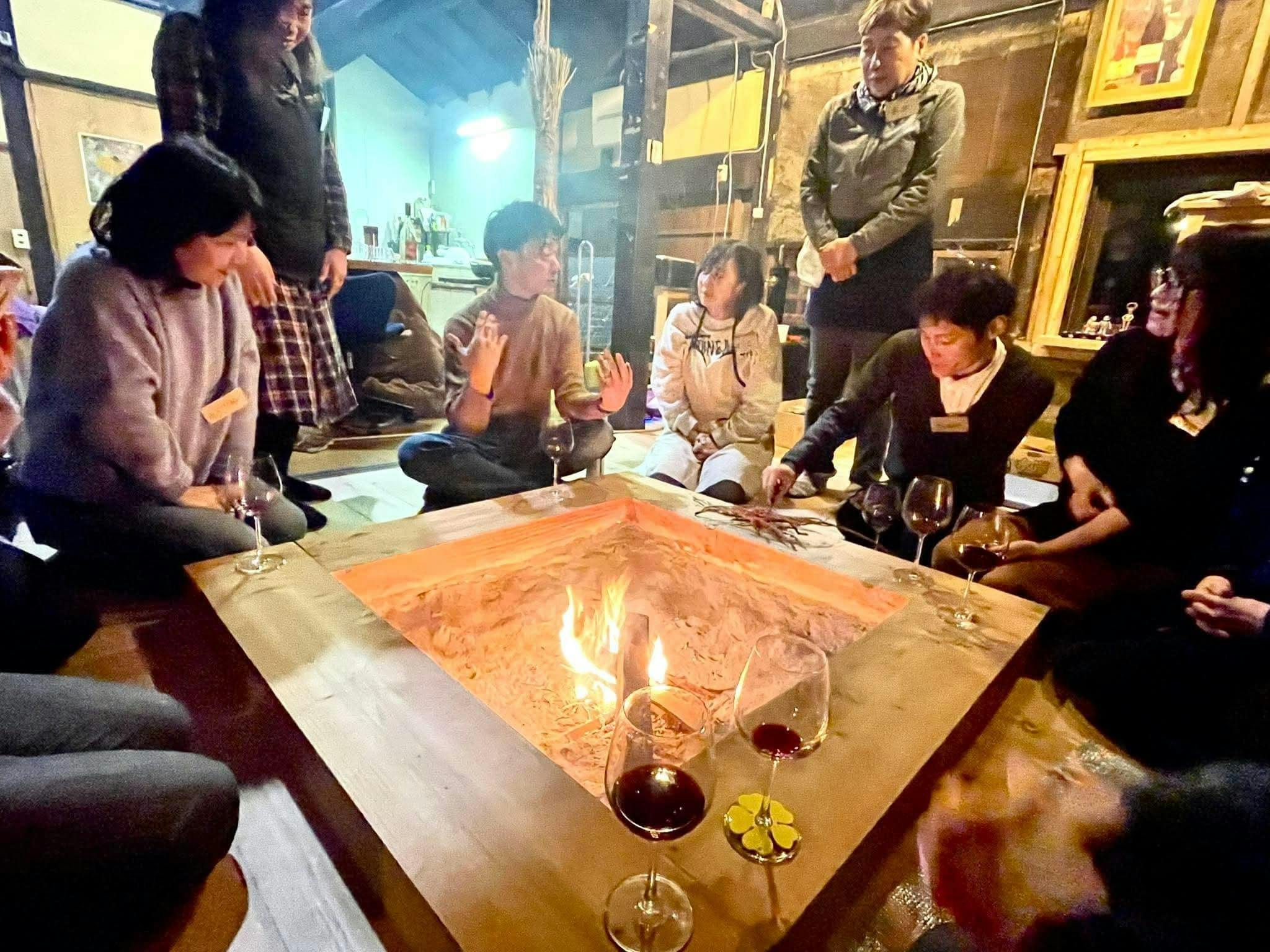 2026/03/02 18:00【活動報告】みんなでつくった「和韻(わいん)の囲炉裏」が完成しました 村びとの皆さま、こんにちは。ワイン村 村長のおーみんです。今日はとても嬉しいご報告があります。ワイン村の古民家に、ついに囲炉裏が完成しました!今回の囲炉裏づくりには14人の村びとが集まり、みんなで力を合わせて制作しました。初対面同士の村びともいらっしゃったので、まずは「村びとネームプレート」を用意して自己紹介からスタート。そこから・囲炉裏づくりチーム・粘土づくりチーム・囲炉裏道具「弁慶」づくりチーム・撮影チーム・お料理チームと、それぞれの持ち場に分かれて作業開始。まるでお城を築くようなプロジェクトになりました実はその場にいた誰ひとり、囲炉裏づくりを経験したことがありません。それでも「こうしたらいいんじゃない?」「ここは任せて!」と、みんなで工夫しながら協力し合い、約8時間かけてついに完成‼そして迎えた囲炉裏の点火式。火が灯った瞬間、その場にいた全員が思わず声を上げるほどしびれる瞬間でした気づけばみんな、囲炉裏の魅力に取り憑かれた“イロリスト” に!素敵な囲炉裏をつくるというひとつの目標をみんなで達成し、その瞬間、チームがひとつになった感覚は鳥肌ものの感動でした。そしてこの囲炉裏には、名前がつきました。『和韻(わいん)の囲炉裏』ワインを愉しみながら炎を囲み、日本の古き良き伝統文化を感じられる場所。そんな想いを込めて名付けました。今回のクラウドファンディングにご支援・応援してくださった皆さまのおかげで、ワイン村の夢がまた一つ形になりました。本当にありがとうございます。このみんなの想いが詰まった囲炉裏を、これからワイン村の大切な場所として育てていきます。ワイン村にお越しの際は、ぜひこの素敵な『和韻の囲炉裏』を囲みながら、一緒にワインを楽しみましょう村びとの皆さまと、この囲炉裏を囲める日を楽しみにしています。心からの感謝を込めて。ワイン村 村長おーみん もっと見る