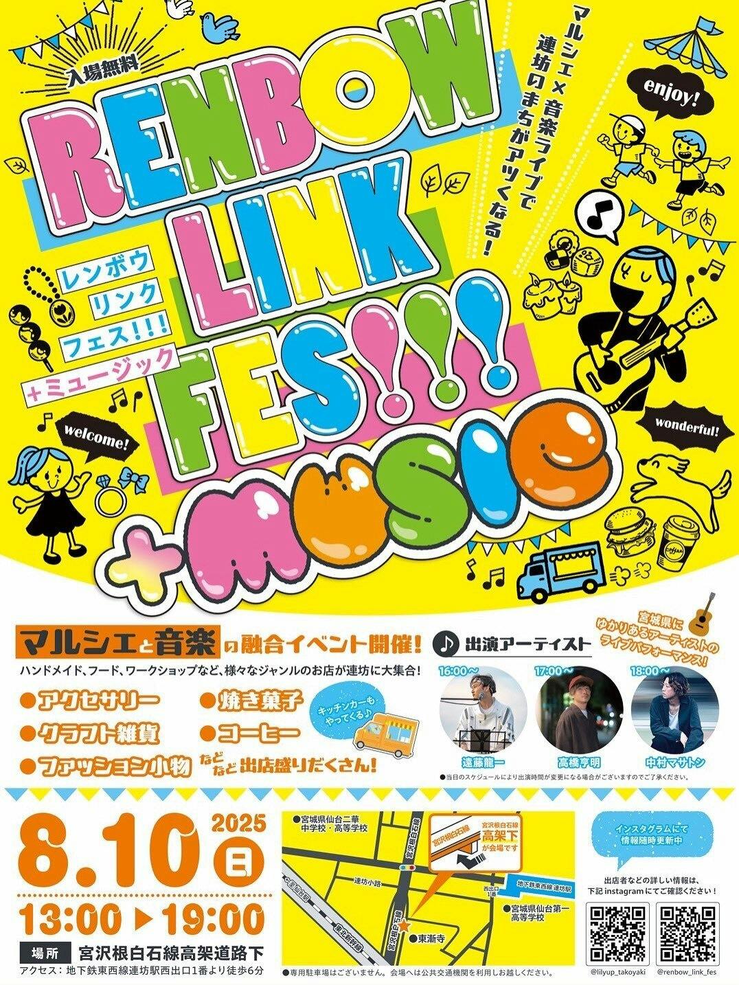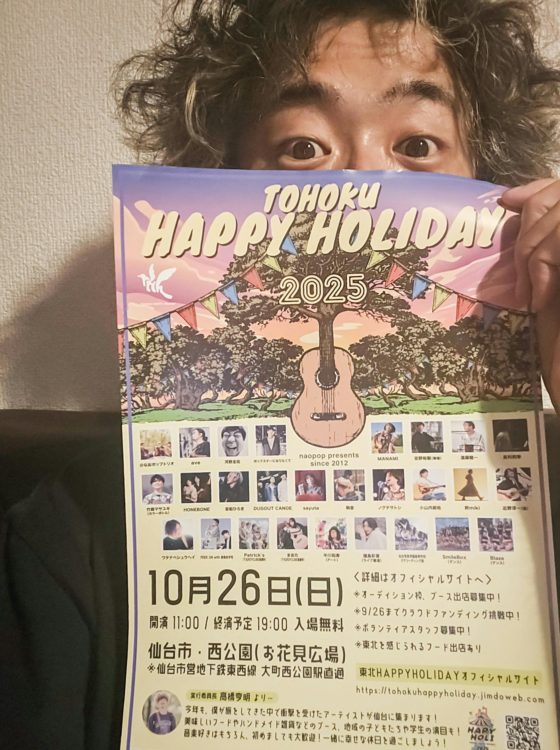 こんばんは。実行委員長の高橋亨明でございます!スタートから48時間が経過し、1日目よりも勢いを増して現在18名様が一員となってくださり、304,500円ものご支援金となっております。達成率は20%本当にありがとうございます!!連休で出費も多いであろうタイミングで、先々の楽しみに位置付けていただけてること、そこへお気持ちをお寄せいただけてること、感謝しかありません。そんな連休の中日、明日は仙台は連坊という街で、歌わせていただきます!ハピホリにもご出店いただきます、閖上たこ焼き「りり~あっぷ」さんからお声がけいただき、彼らの街で解散されるお祭りの、音楽コンテンツを仰せつかり、音響担当もさせていただきつつ、ハピホリ実行委員より僕と遠藤龍一くん、一昨年まで毎年ハピホリにご出演いただいておりました、中村マサトシさんとで音楽を届けさせていただきます!ちょっと天候崩れそうですが、高架下なので雨の心配はあまりないと思います^^■8/10(日)仙台 宮沢根白石線高架道路下(地下鉄東西線 連坊駅西出口1番より徒歩6分)「RENBOW LINK FES!!!+MUSIC」13:00-19:00出演16:00 遠藤龍一17:00 高橋亨明18:00 中村マサトシ※観覧無料※飲食、ハンドメイドなどの出店ありハピホリのチラシの配布もスタートしますよ!是非イベントでの配布初日、直にゲットに来ていただけたら幸いです(⌒‐⌒)お待ちしております!