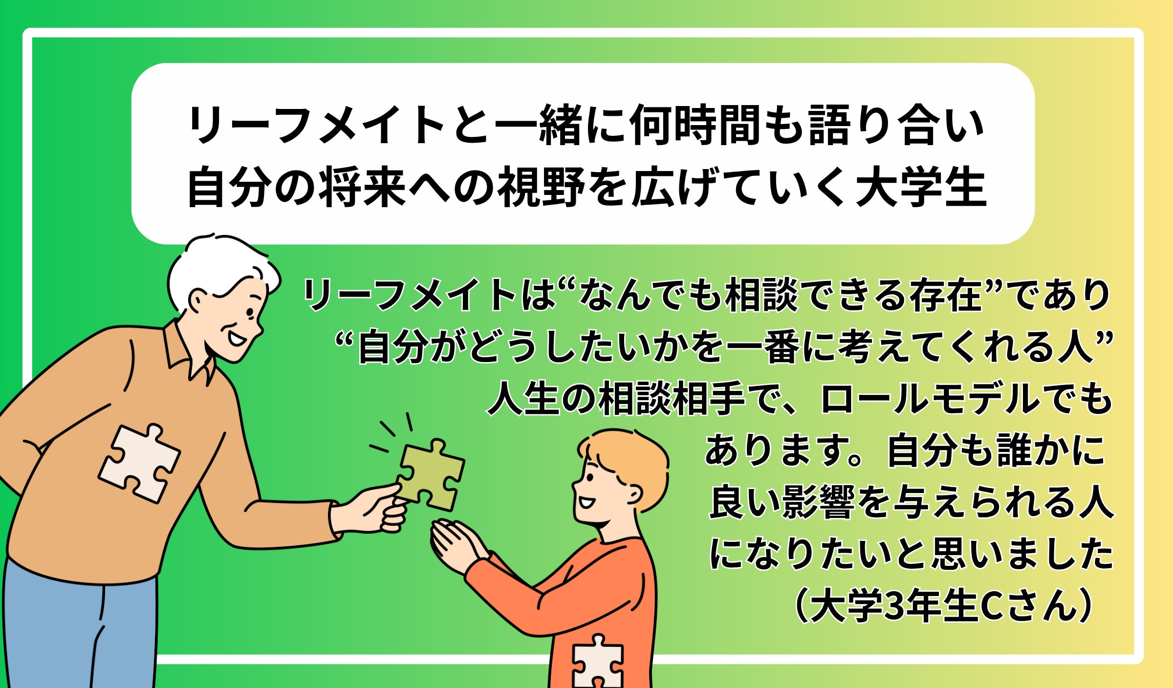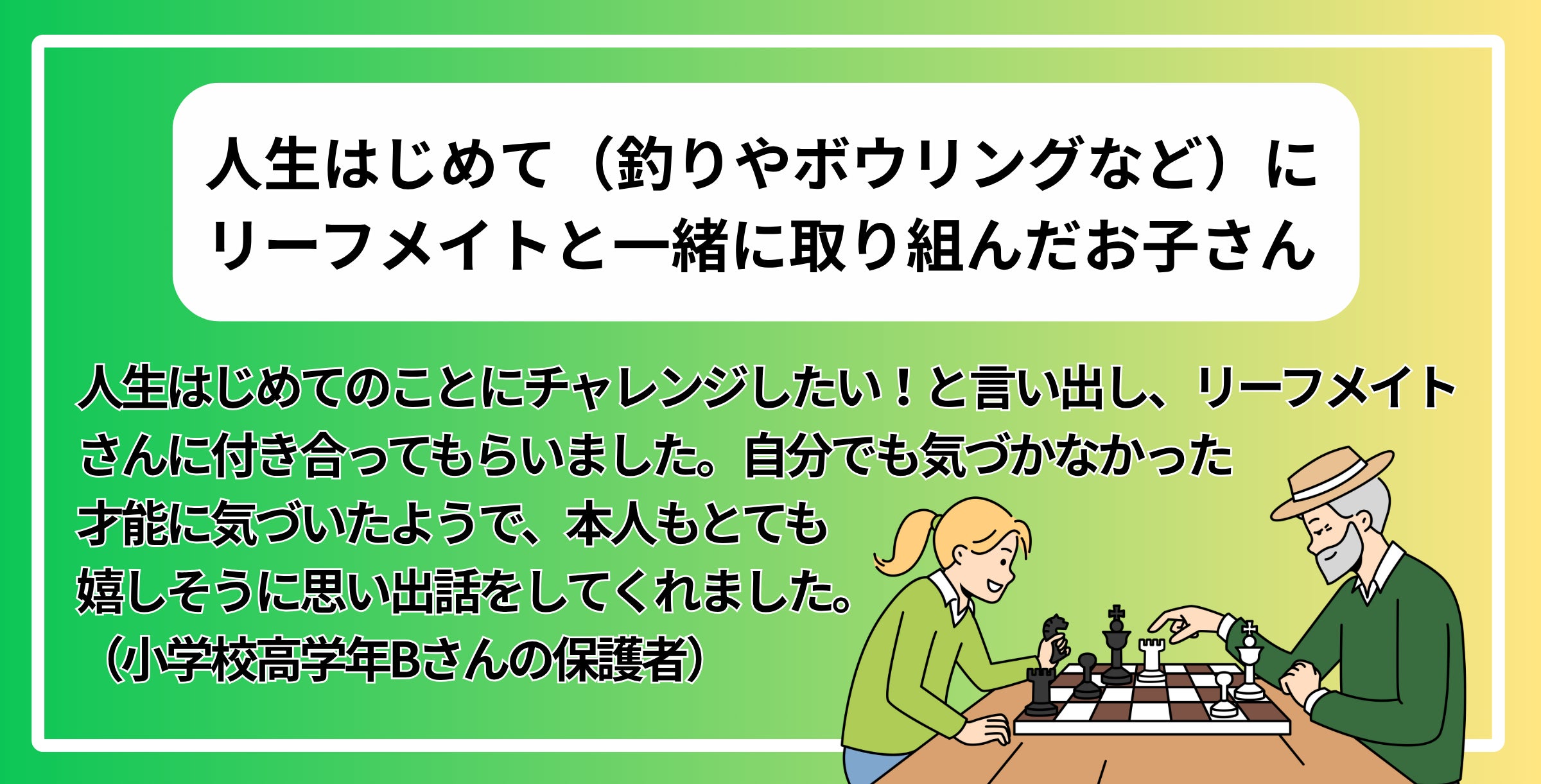 月に数度、数時間。こどもたちは「リーフメイト」と呼ばれる大人と会い、一緒に過ごします。行きたかった場所に行く。話したいことを話す。チャレンジしたいことをやってみる。それだけで、自分を大切に思える時間になります。