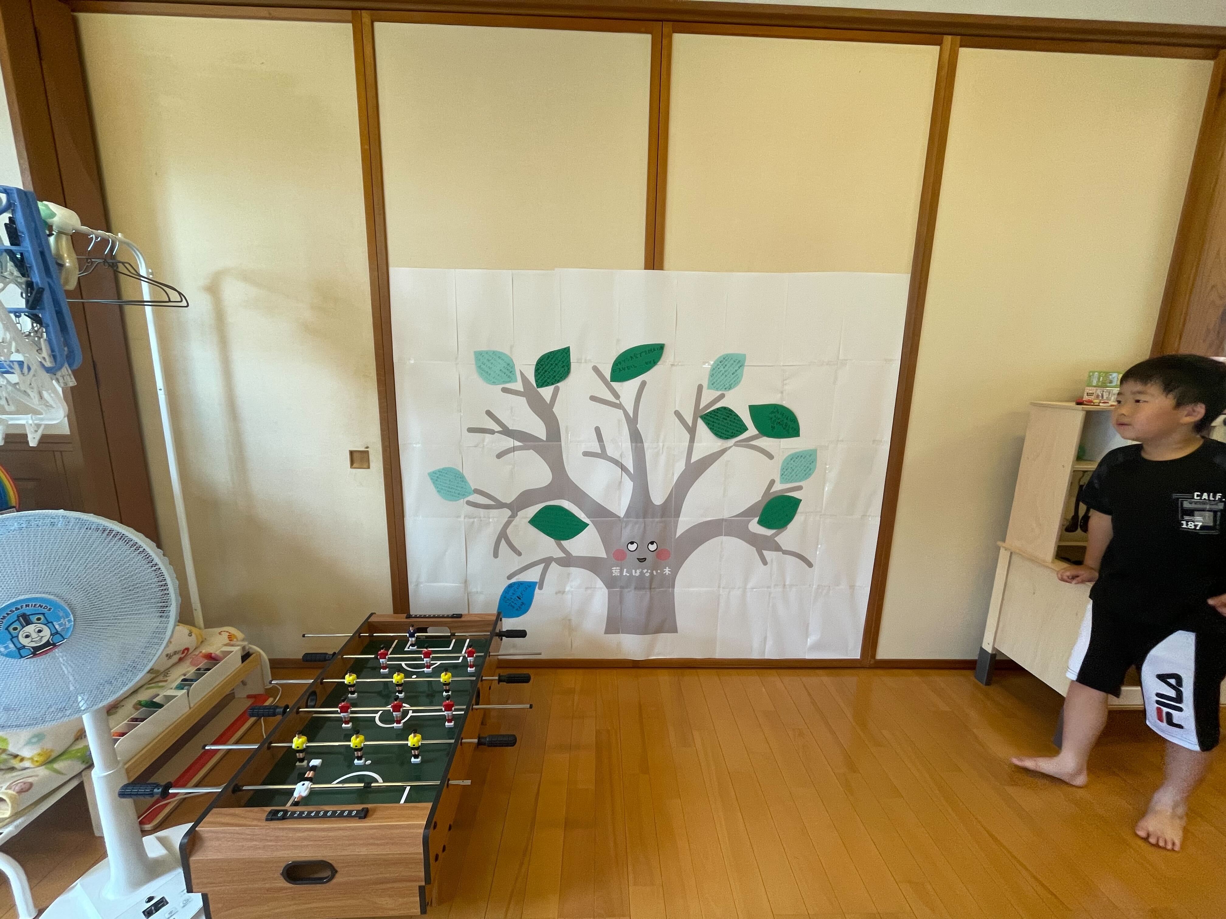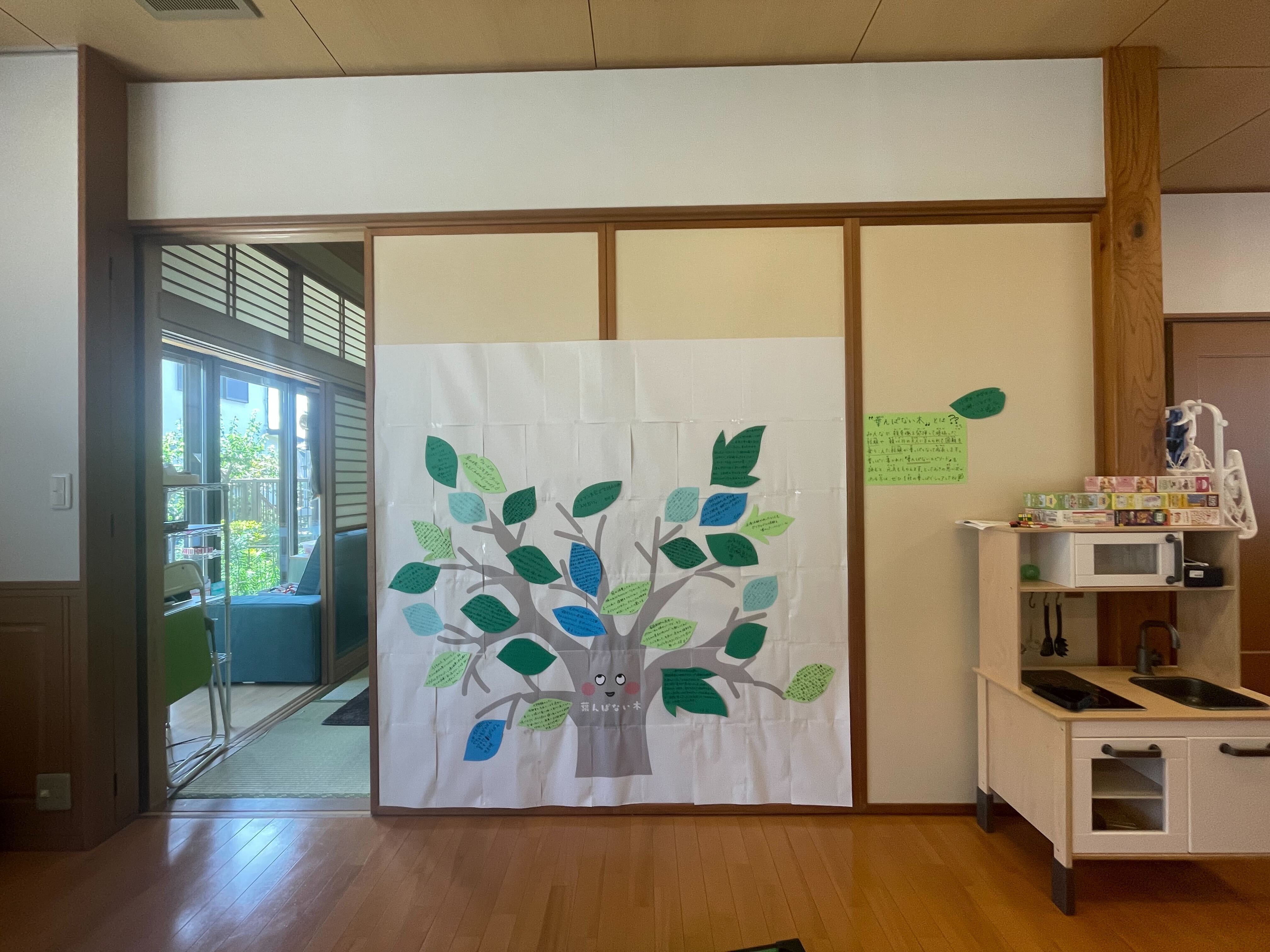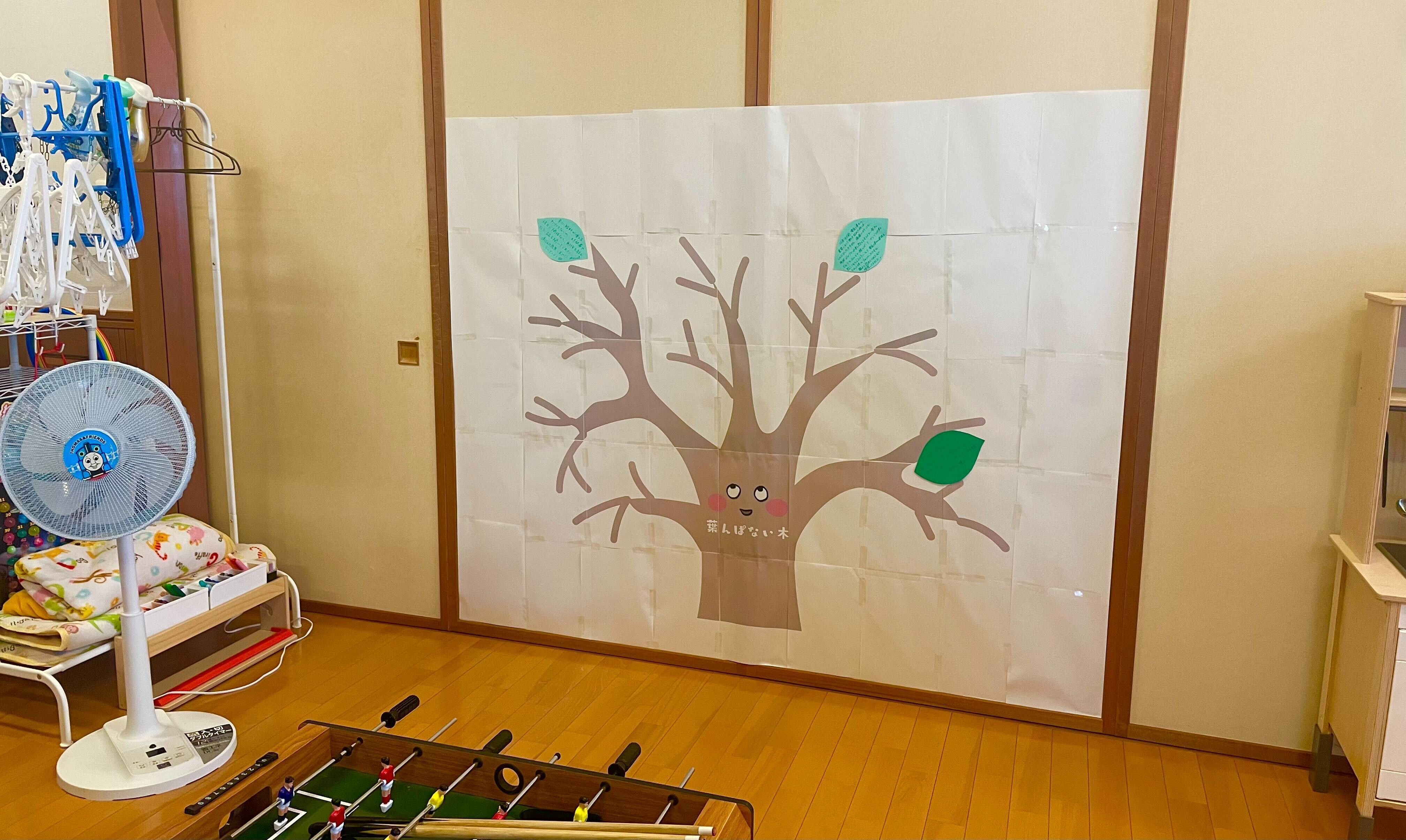 いただいたエピソードは、葉っぱのかたちで「葉んぱない木」に貼り、みんなで育てています。