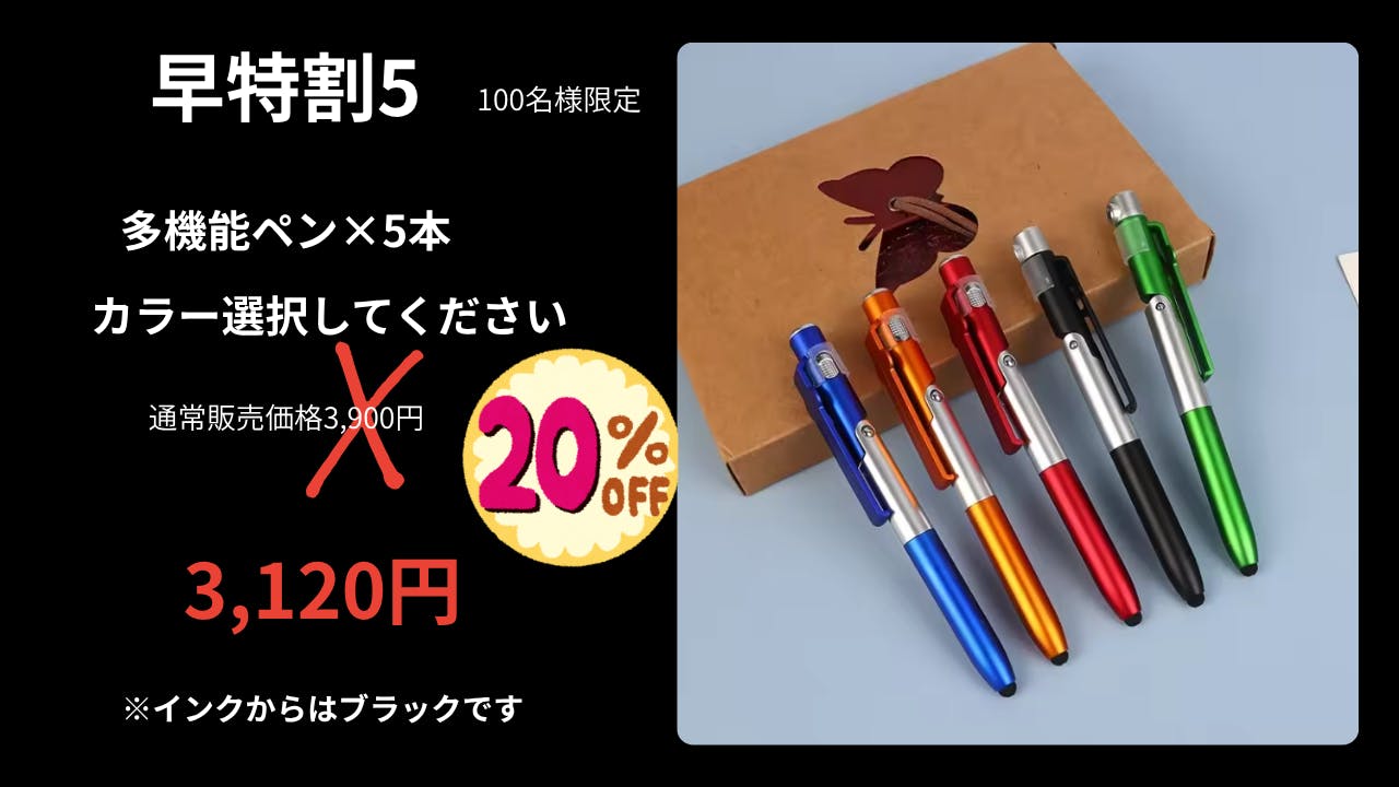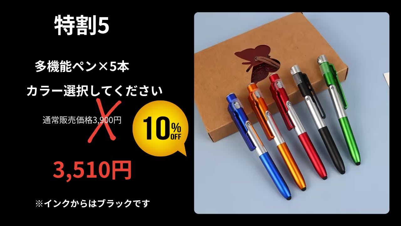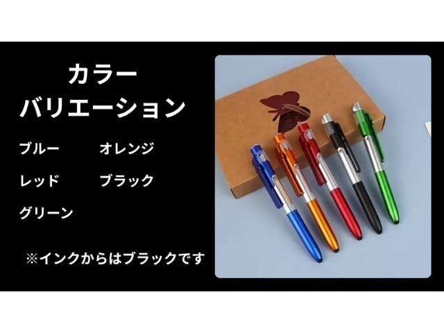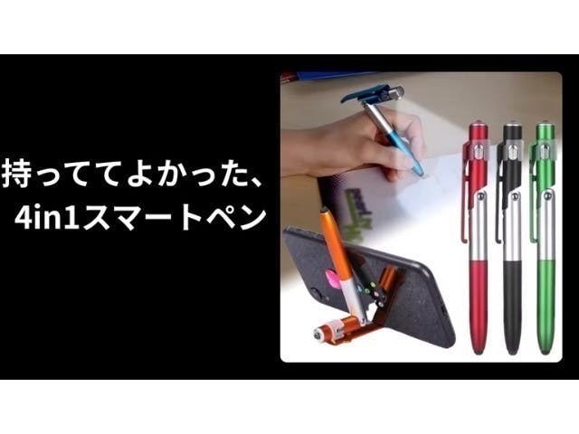 ボールペン機能:滑らかな書き心地でビジネスや日常使いに最適。LEDライト搭載:暗い場所や停電時、夜間の作業時にも役立つ強力なLEDライトを内蔵。スマホスタンド機能:ペンをスマートフォンの背面にセットするだけで、65°の角度で立てかけられる簡易スタンドに変身。動画視聴やビデオ会議にも便利。タッチペン機能:スマートフォンやタブレットの画面操作がスムーズに。冬の寒い日や指紋汚れを防ぎたいときに最適です。