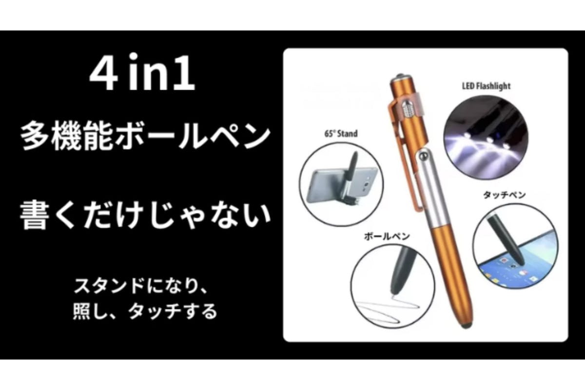 1本で4つの機能を備えた、多機能ボールペンが登場!「書く」「照らす」「立てる」「操作する」の4in1設計で、ビジネス・プライベート・アウトドア・防災まで、さまざまなシーンで大活躍する便利なアイテムです。スマートなデザインと豊富なカラーバリエーション(ブラック、ブルー、オレンジ、グリーン、レッド)で、男女問わずお使いいただけます。