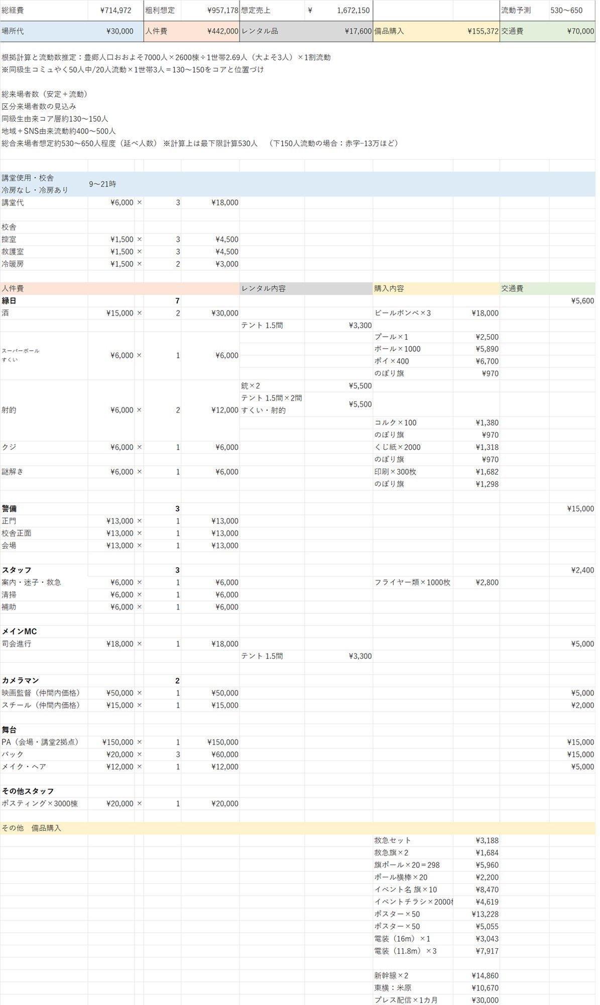 ※中核規模のイベントの為、個人管理の懸念の場合、管理企業を1社起用。その場合、想定とし10~20万ほどの足出を想定。開催における70~90万をクラファン想定範囲に位置づけている。内30万程を自己資金にて先経費とし流入予定。