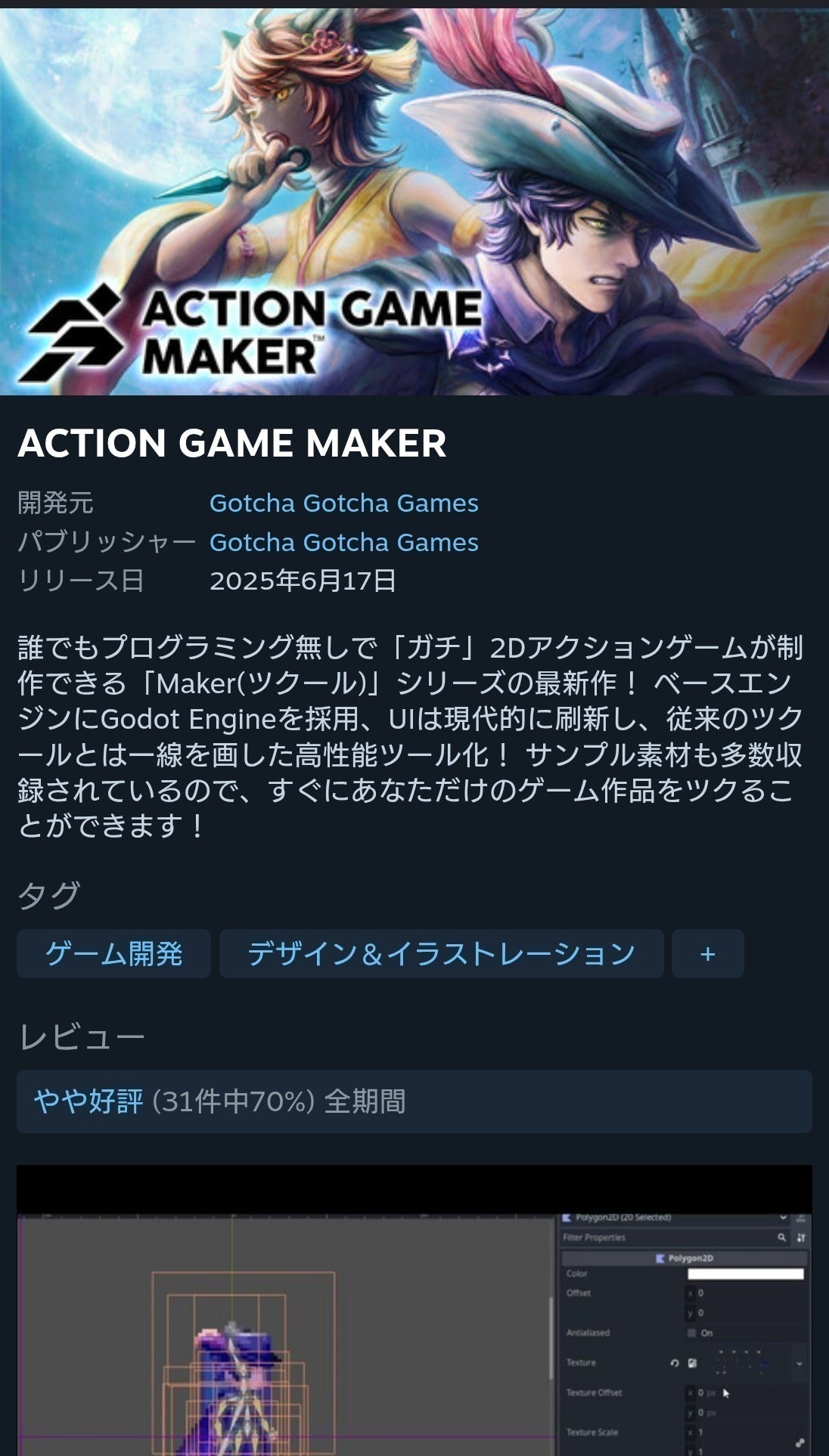 2025年6月に発売される新ツール「ACTION GAME MAKER」は、Godot Engineをベースにした直感的な操作性が特徴です。