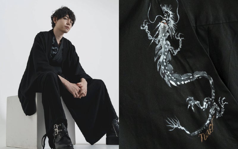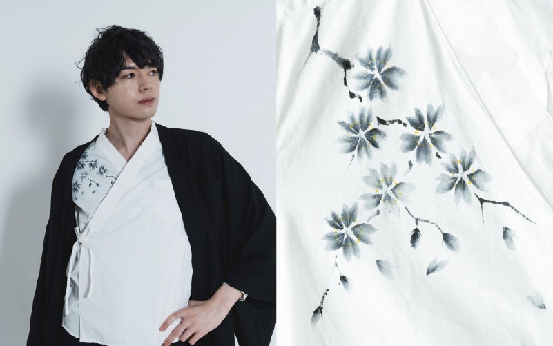 KUDENの定番着物襟シャツに、ナオさんが一着一着、オーダーごとに手描きで龍と桜を描き上げる世界に一枚だけの特別なシャツです。