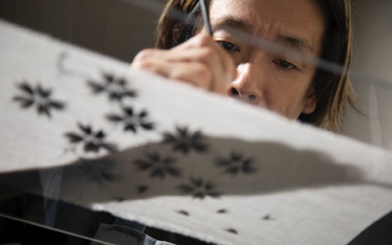 水分をたっぷり含んだ筆で描くその色彩は、滲みながら生き物のように布の上で広がります。まるで呼吸しているかのような模様が、目の前で生まれるのです。