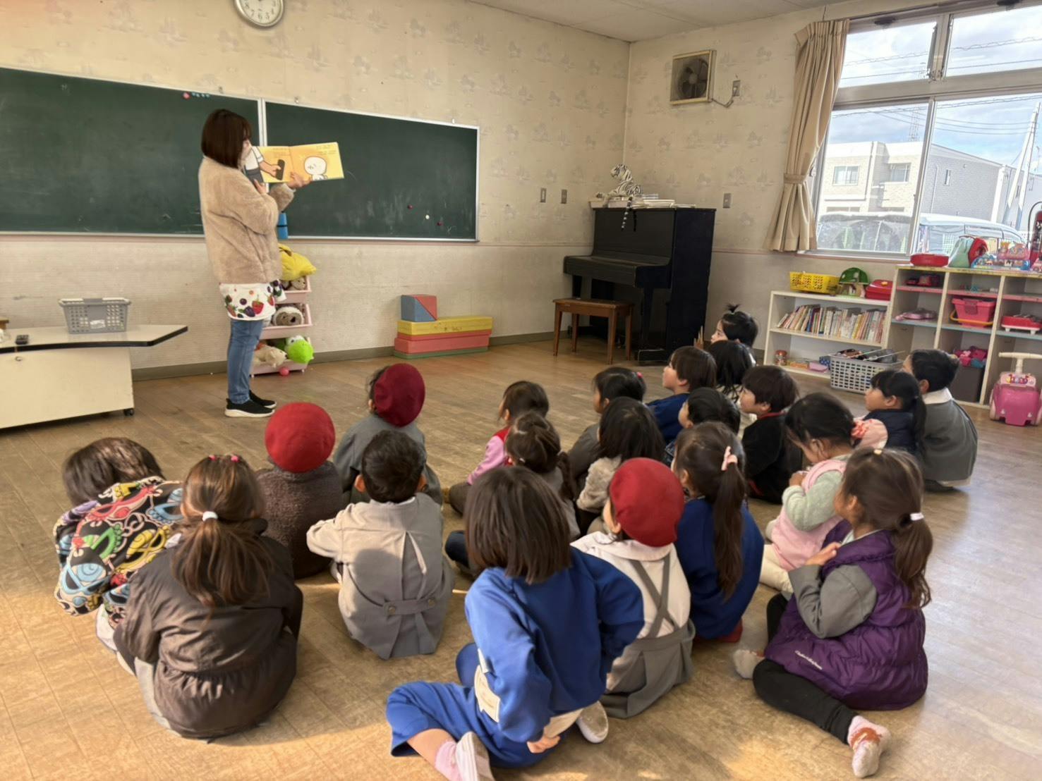 先生が絵本『ふがしやのコトン』を読み聞かせしてくださり、子どもたちは静かに耳を傾けながらお話に夢中になっていました。