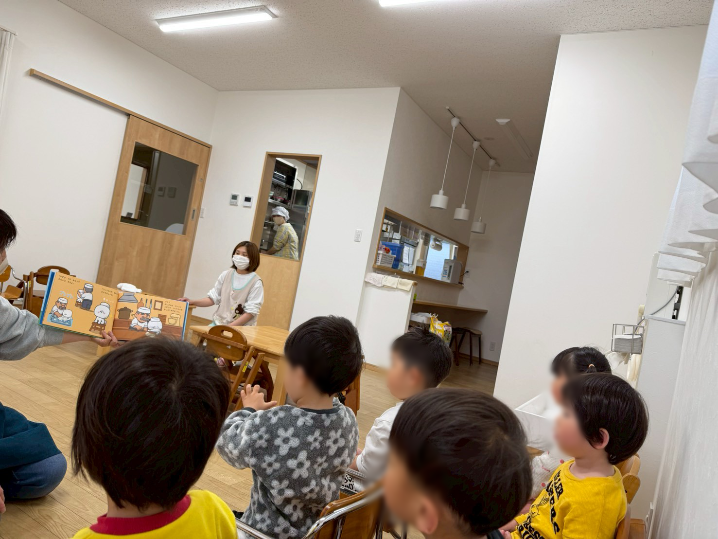 園では、子どもたちが実際にふ菓子を味わい、先生方が絵本を読み聞かせしてくださっています。