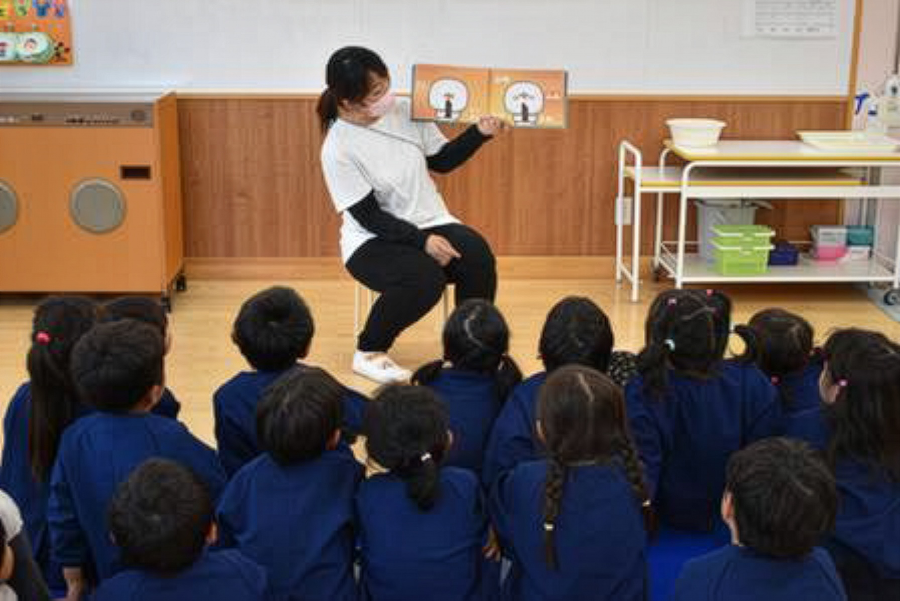 園では、子どもたちが実際にふ菓子を味わい、先生方が絵本を読み聞かせしてくださっています。