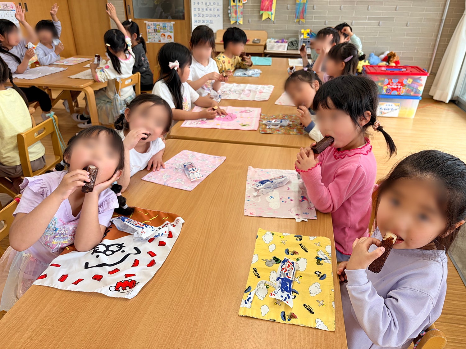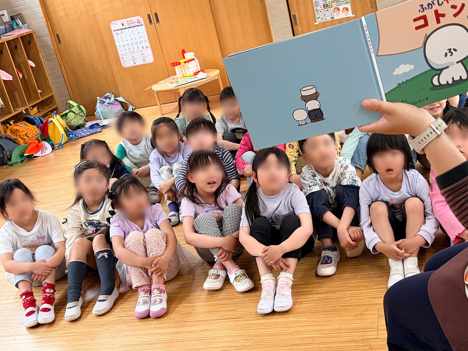 園では、子どもたちが実際にふ菓子を味わい、先生方が絵本を読み聞かせしてくださっています。