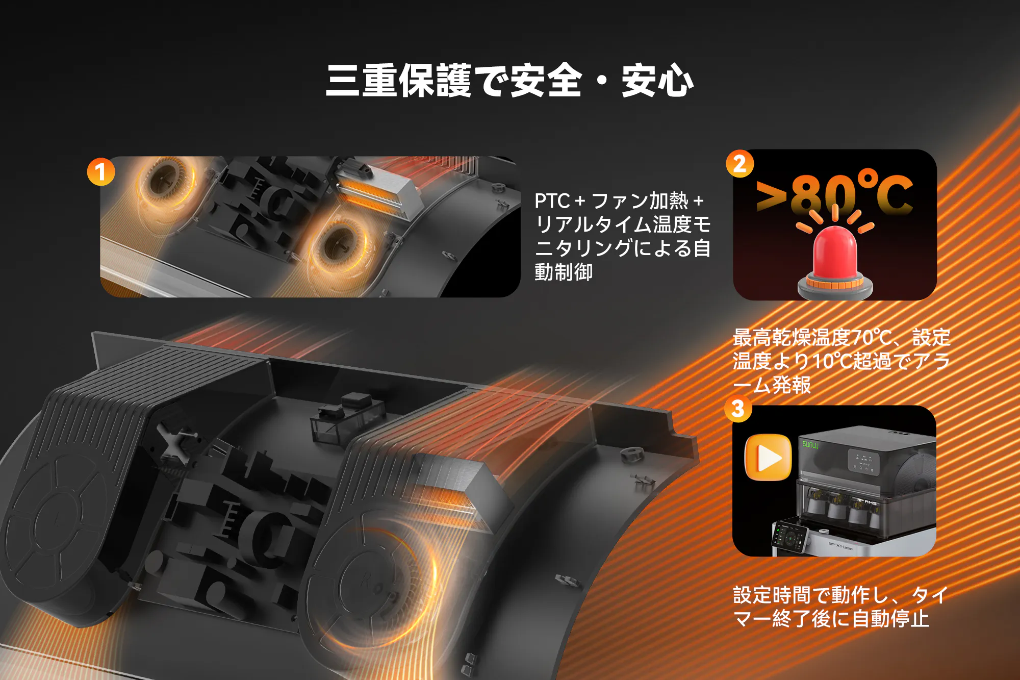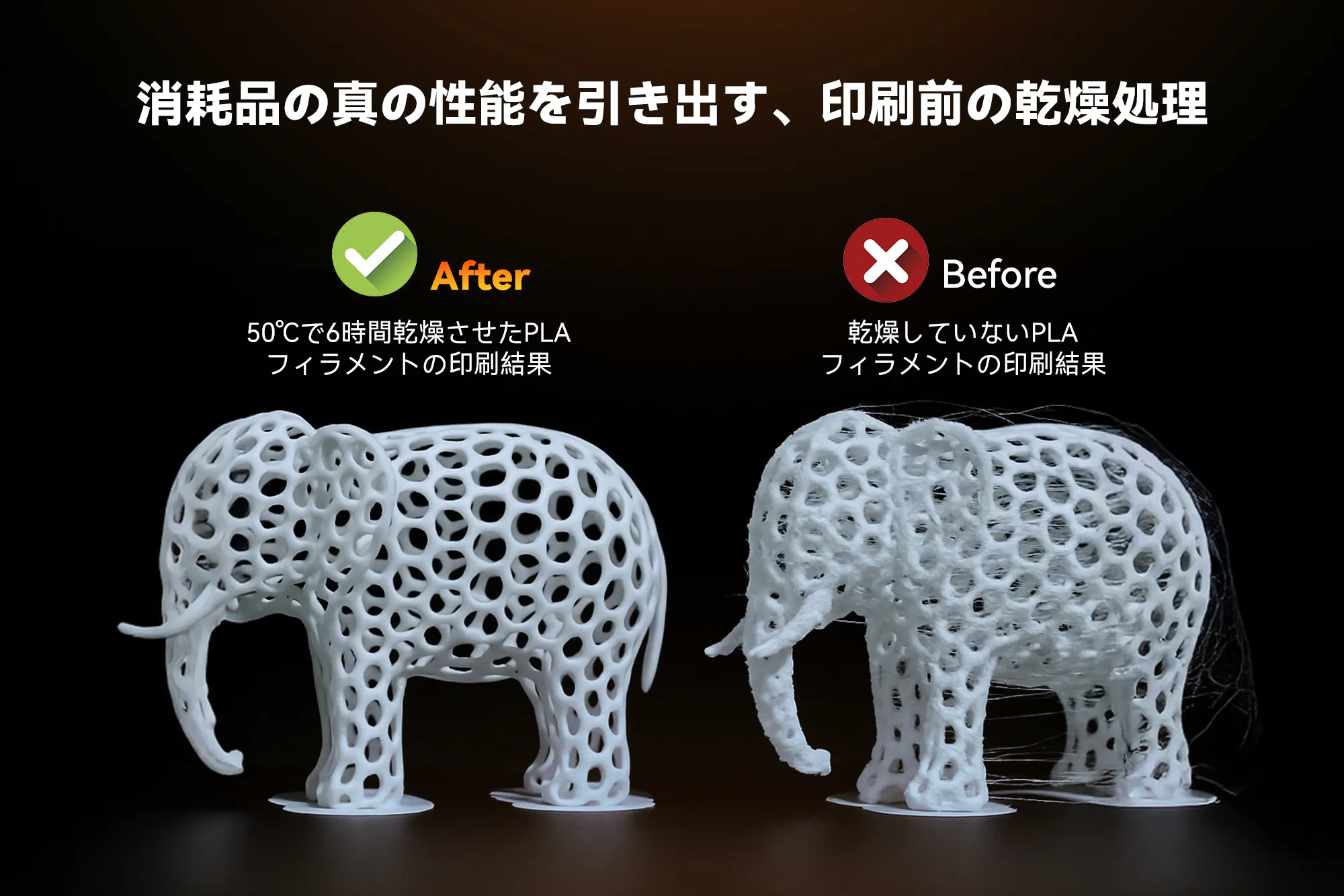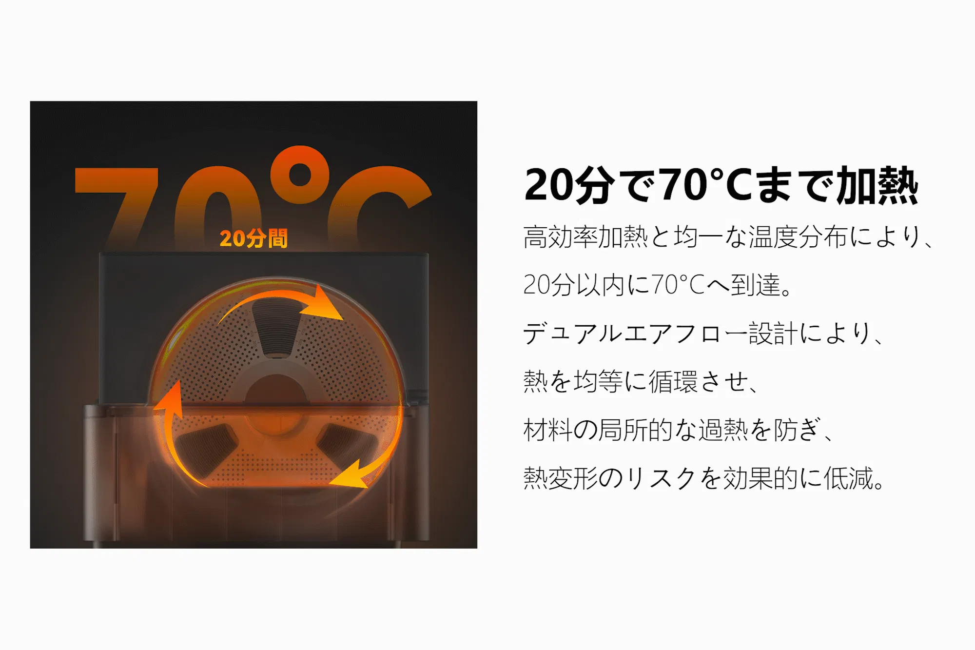 - 設定温度が70℃の場合は、フィラメントスプールの耐熱性が70℃以上であることを確認してください。
